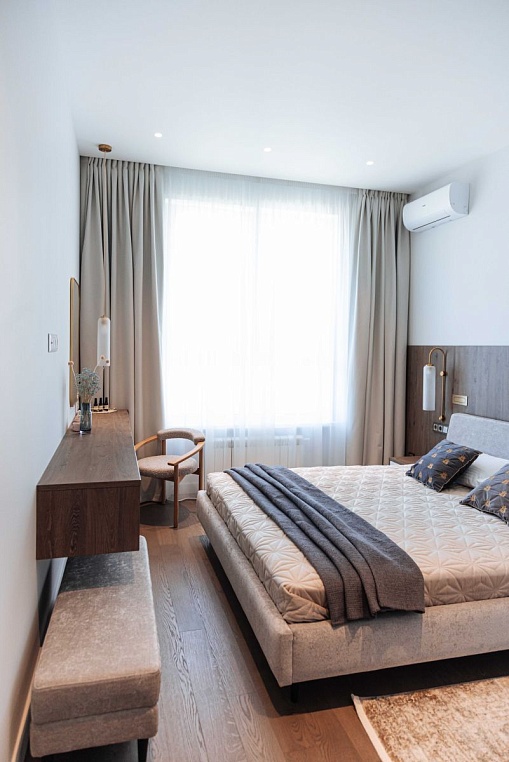 Спальня - место, где мы отдыхаем после долгого дня, поэтому важно, чтобы она была уютной и комфортной. Создать идеальную атмосферу поможет мебель, изготовленная по индивидуальному проекту. В этой спальне установлена мебель, выполненная из ЛДСП Egger с древесным декором. Стеновая панель, прикроватные тумбы и навесная тв-зона выполнены в едином стиле и создают гармоничное пространство. Тумбы и тв-зона имеют фасады из белого ЛДСП, которые идеально сочетаются с древесным корпусом. Это придает спальне свежий и современный вид. Мебель по индивидуальному проекту позволяет создать уникальное пространство, которое будет соответствовать вашим потребностям и стилю жизни. *Указана минимальная стоимость изделий без учета стоимости услуг.