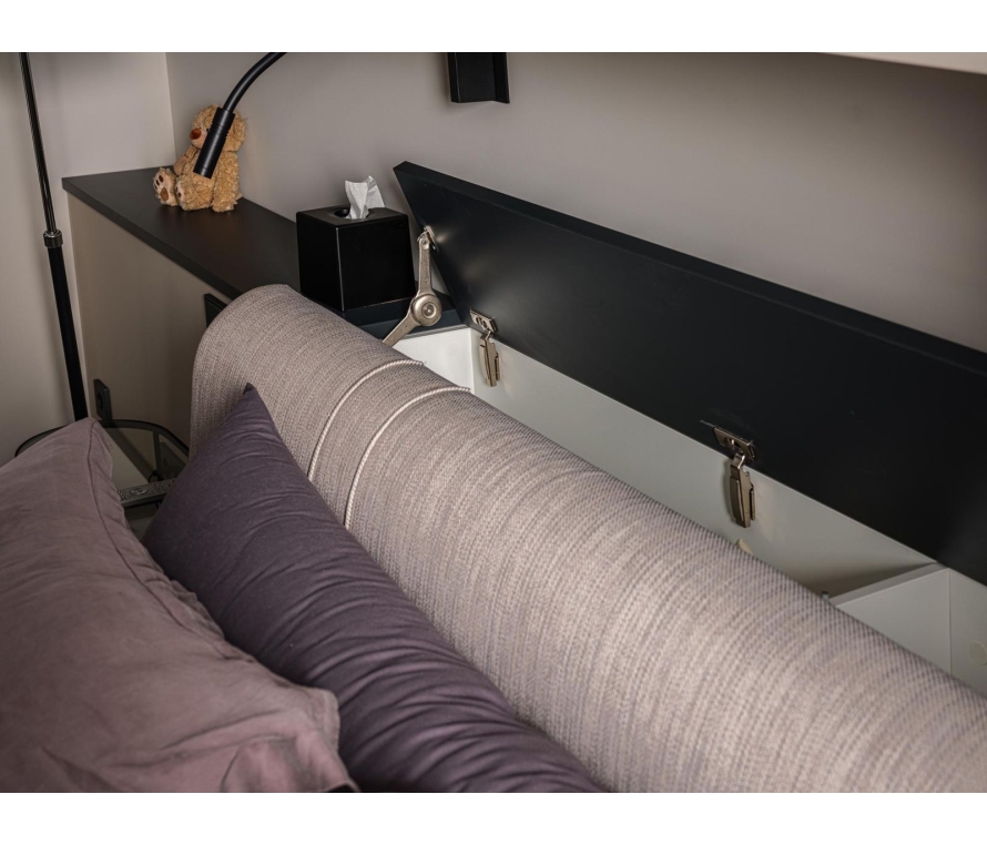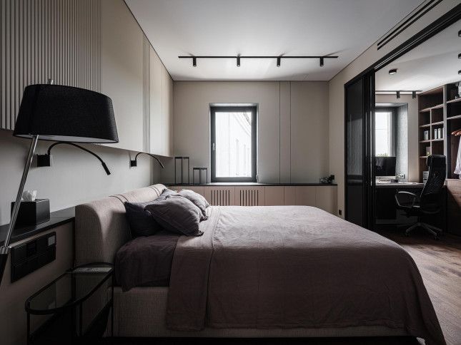 В мужской спальне по периметру двух стен расположилась корпусная мебель, что позволило максимально эффективно использовать пространство комнаты. У изголовья кровати установлены навесные шкафы, за изголовьем находится ниша, где можно разместить книги, аксессуары или другие предметы. Навесные шкафы "уходят" за натяжной потолок, что позволяет оптимально использовать пространство и создать эффект лёгкости. Дополнительные места для хранения вещей расположены и по периметру второй стены за распашными фасадами, которые легко открываются нажатием. Фасады, за которыми находятся батареи, также открываются и имеют сквозную фрезеровку, что обеспечивает циркуляцию воздуха и лёгкий доступ к батареям для их обслуживания. Фрезерованные фасады в сочетании с глухими придают мебели индивидуальный вид. Декор мебели идеально сочетается с декором столешницы, чёрным матовым профилем подвесных дверей-купе и тонированным стеклом, создавая стильный и современный образ спальни.