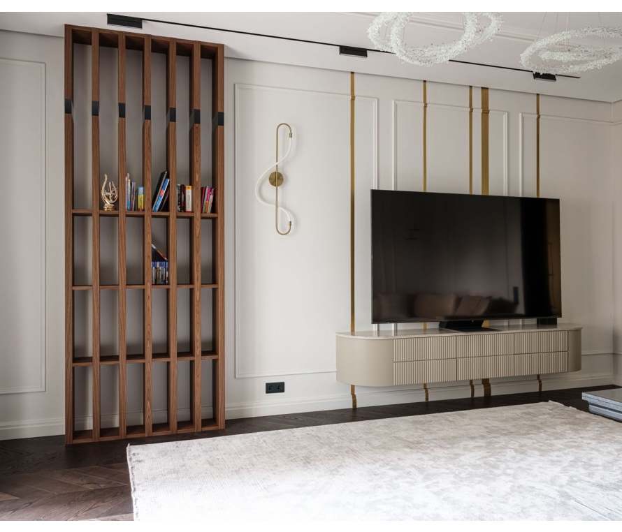 Навесная тумба с фрезерованными фасадами из МДФ в матовой эмали и каменной столешницей - не просто стильный предмет интерьера спальни и гостиной, а и функциональная тв-зона. Тумба выполнена из фрезерованных фасадов МДФ в матовой эмали, что придает ей элегантный и современный вид. Столешница выполнена из прочного и устойчивого к царапинам камня, который обеспечивает долговечность и надежность конструкции. Благодаря своей компактности и универсальному дизайну, тумба впишется в любой интерьер. Он станет отличным решением для небольших помещений, где необходимо максимально эффективно использовать пространство или в помещении, где хочется создать ощущение простора и воздуха. Интерьер гостиной дополняет открытый стеллаж из шпона с декоративными глянцевыми вставками из МДФ. *Указана минимальная стоимость изделия без учета стоимости услуг