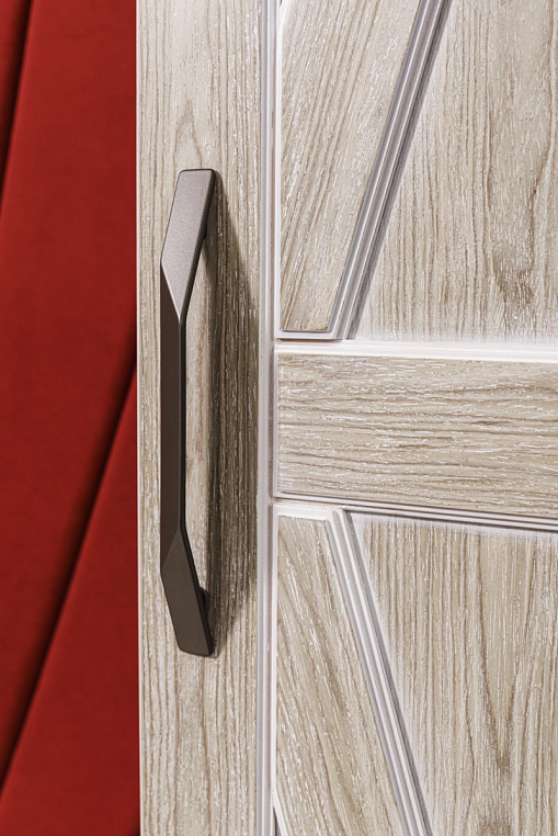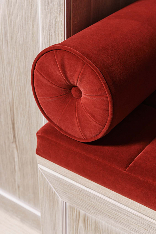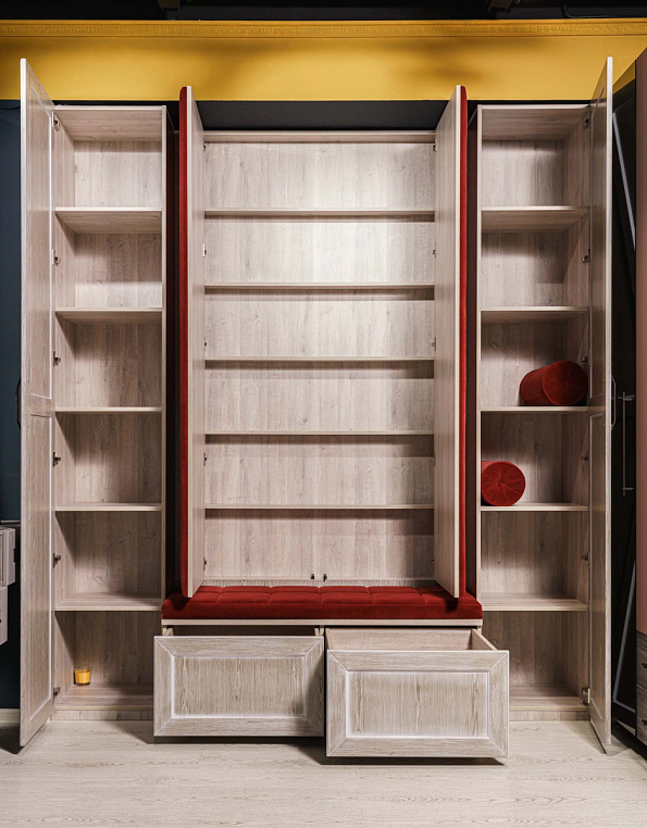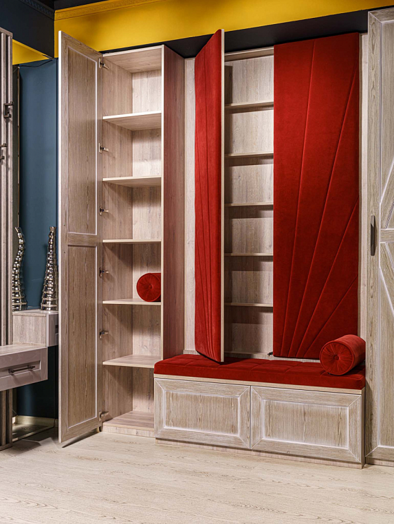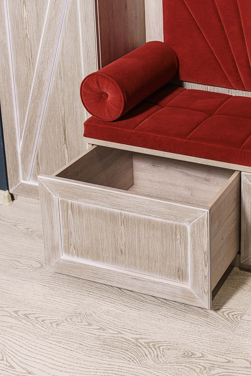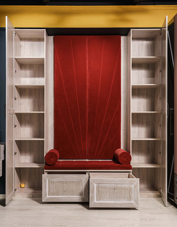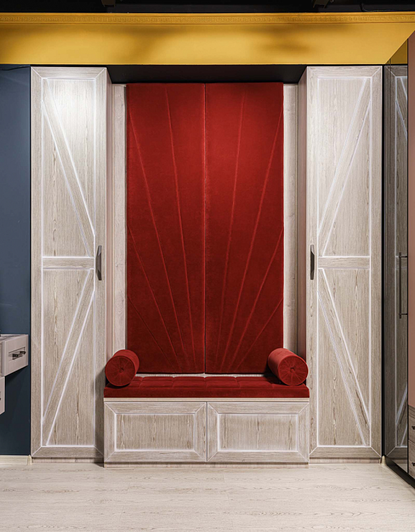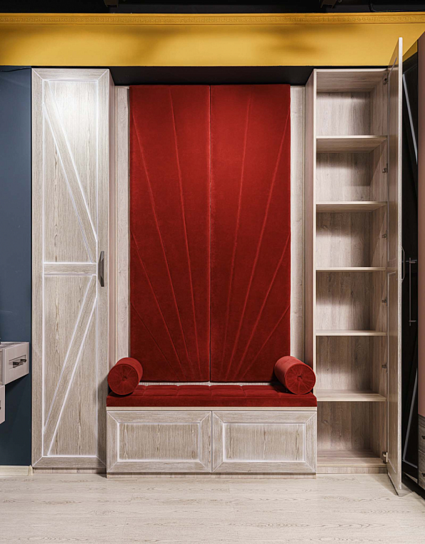 Прихожая с мягким элементом. Комбинированные фасады представлены шпоном и мягкой панелью яркого цвета с индивидуальным рисунком, внутри которой Вы можете расположить все самое необходимое, спрятать щитки и прочие детали. Размеры полок в боковых шкафах позволят разместить в шкафу как аксессуары, так и коробки с обувью. Дополнительным местом для хранения выступают вместительные ящики. Благодаря использованию механизмов Мовенто, ящики легко открываются и закрываются без использования ручек. *Указана минимальная соимость образца без учета стоимости услуг