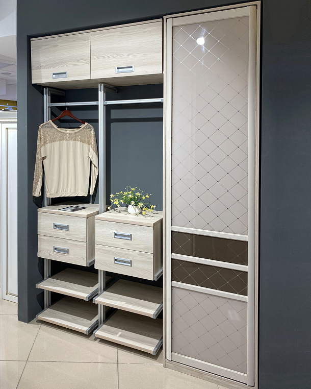 Внутреннее наполнение: Полки, штанга выдвижная, 2 полки-сетки для обуви.Навесная антресоль,ящики выдвижные и штанги в колонной системе-открытые элементы