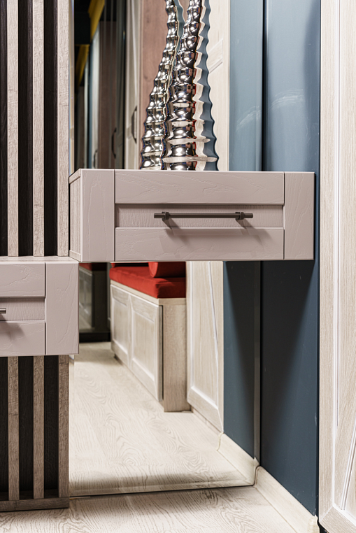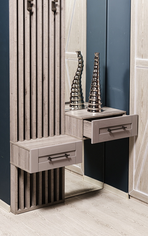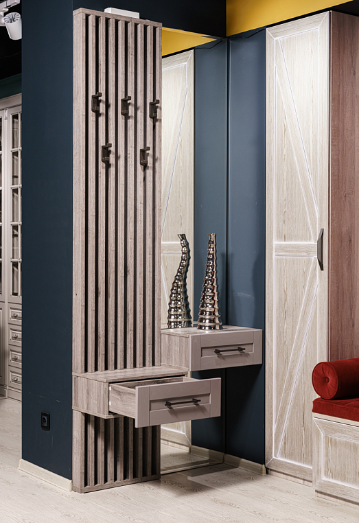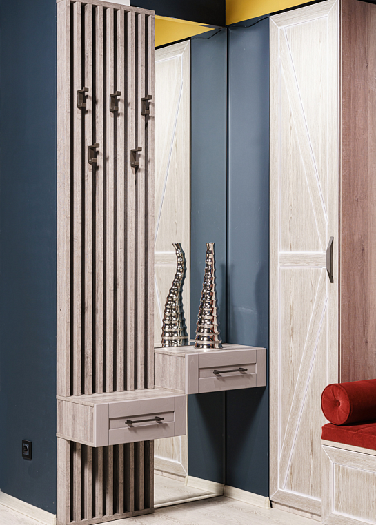 Эта прихожая влюбляет в себя каждого! Если Вы хотите поразить своих гостей оригинальностью и креативностью, то прихожая с рейками и шпонированными фасадами ящиков для Вас! Современный стиль в сочетании с фактурой дерева. Фасады, выполненные из шпона ясеня, делают данную композицию очень привлекательной . Обратите внимание на фурнитуру: крючки словно созданы под эти рейки и придают прихожей некую брутальность, ручки же идеально сочетаются с крючками и придают легкость композиции. *Указана минимальная стоимость изделия без учета стоимости услуг