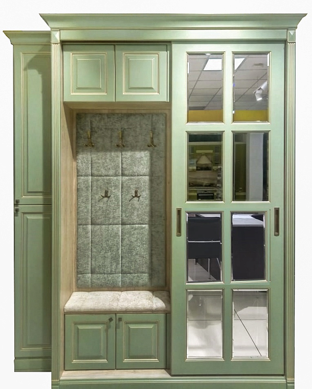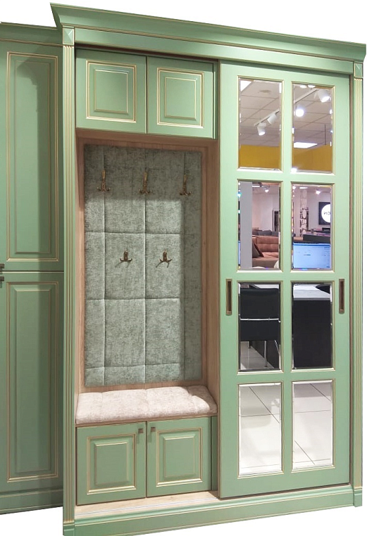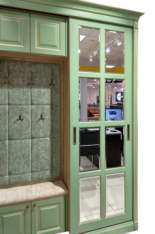 Прихожая с мягким элементом. Фасад изделия - двери-купе из МДФ эмаль с патиной "золото" дополнены наклдадным и врезным рельсом, покрас по Ral бледно-зеленый, вставка - зеркало серебро c фацетом. Корпус изделия - ЛДСП Egger Дуб Небраска натуральный Изделие дополняют пилястра "пирамидка", розетка "прямая" и врезная ручка. *Указана стоимость изделия в минимальной комплектации без учета стоимости услуг