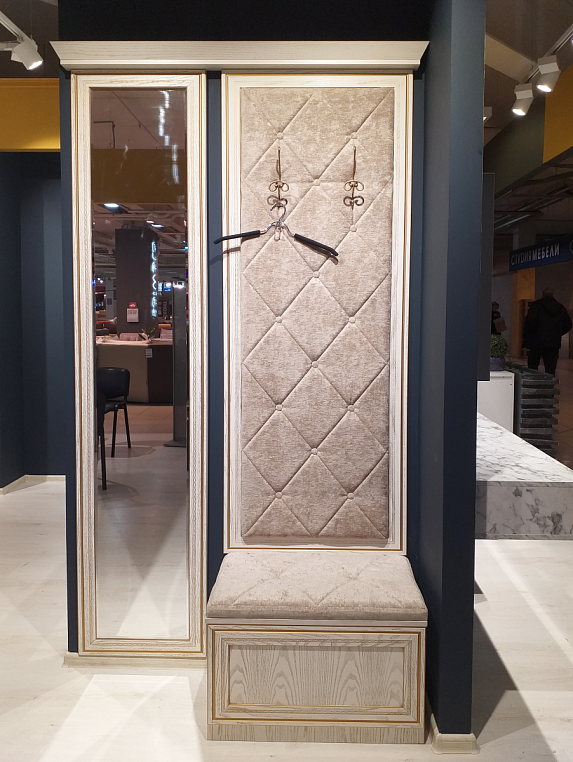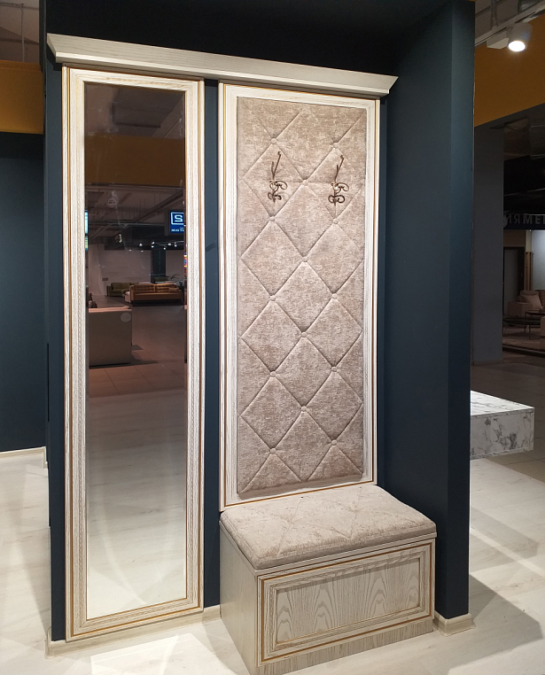 Прихожая с мягким элементом. Фасад - шпон, мягкие элементы - ткань, стежка + пиковка, зеркало Корпус - Шпон Мерано Pure white, патина. Внутреннее наполнение - полка сетка для обуви. *Указана минимальная стоимость выставочного образца без учета стоимости услуг.