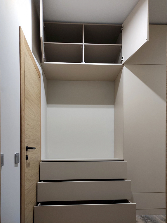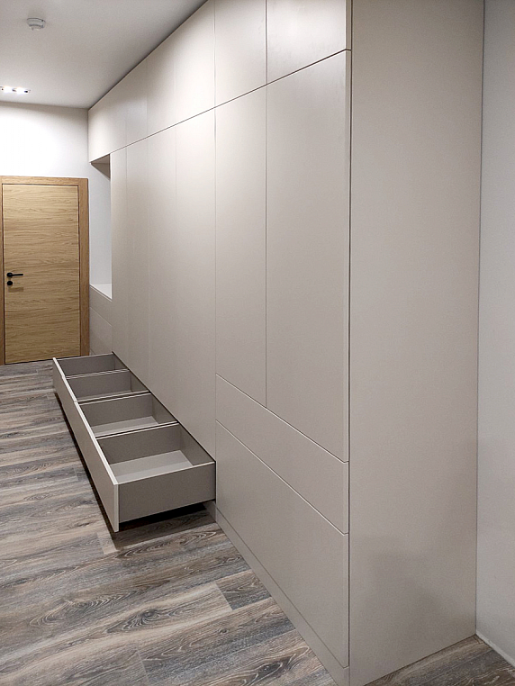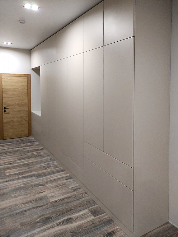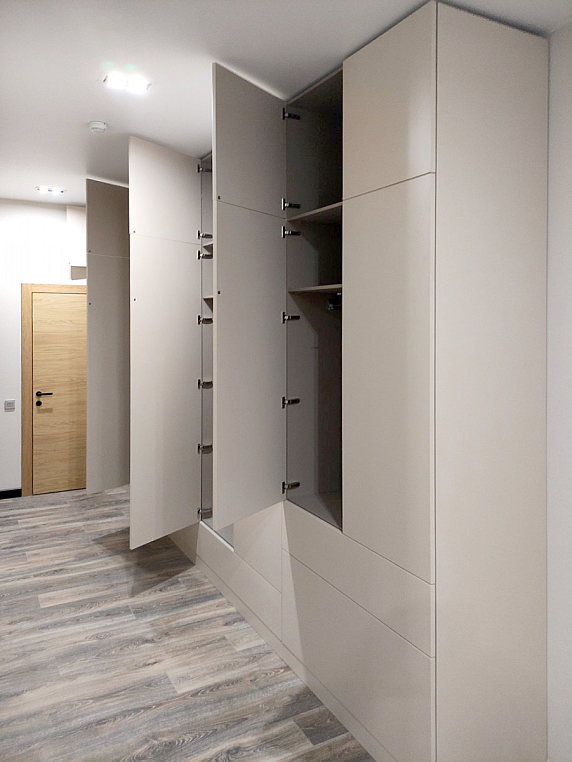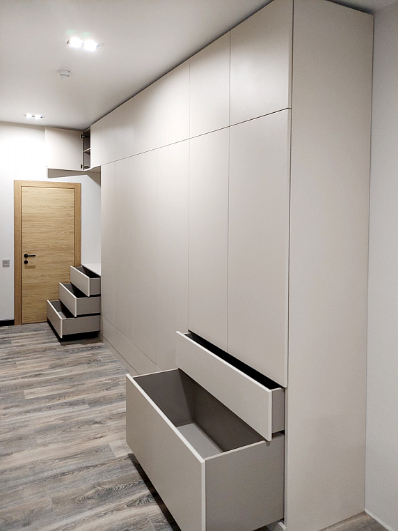 Прихожая с распашными фасадами из МДФ эмаль (покрас по Ral) , которые обладают плотной структурой, аналогичной структуре натурального дерева. Прочные и высокоустойчивые плиты МДФ позволяют реализовать любую дизайнерскую идею. Корпус прихожей выполнен из ЛДСП Egger декор Серый камень нейтрального оттенка, который гармонирует с разными современными древесными декорами с долей серого. Декор обладает бархатистой на ощупь структурой. Натуральный вид декора делает его популярным в дизайне жилых помещений. Внутреннее наполнение - полки, ящики и горизонтальные трубы
