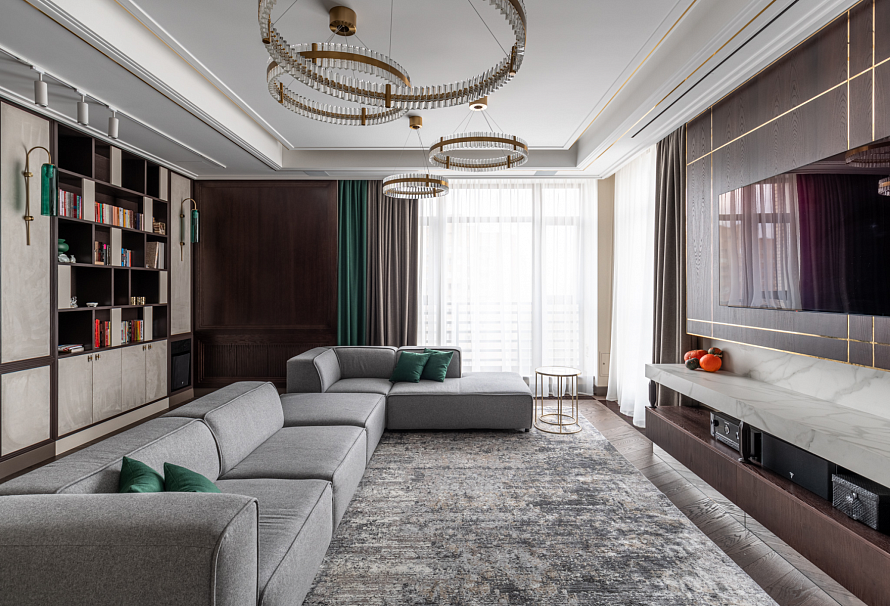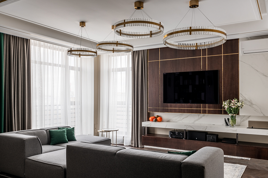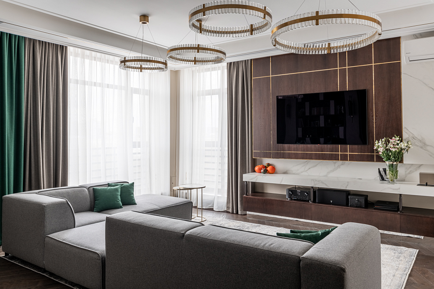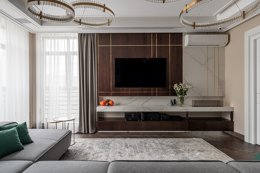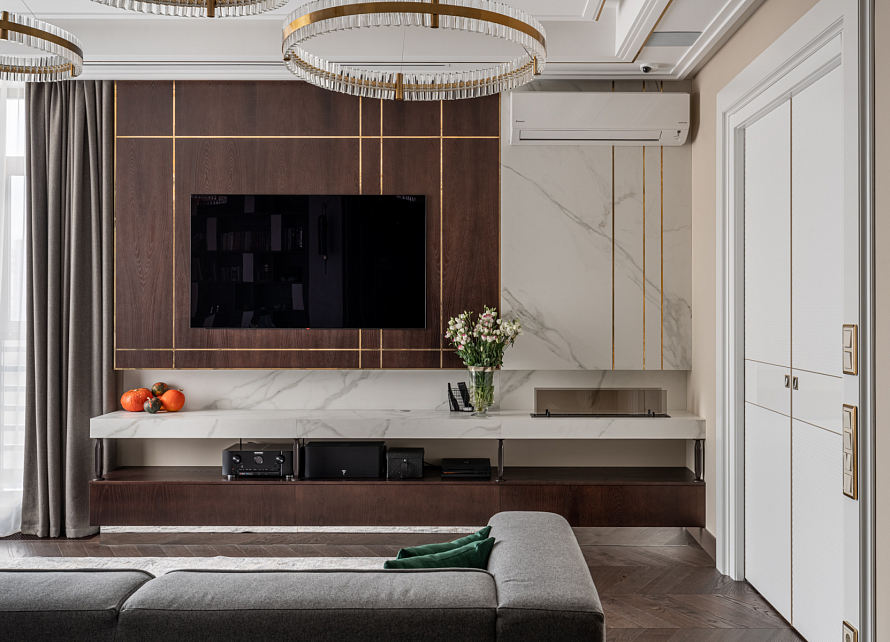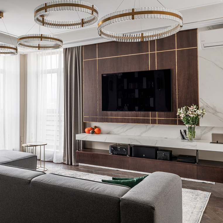 ТВ-зону смело можно назвать главным объектом гостиной, местом семейного отдыха. Поэтому её дизайн требует грамотного подхода. Чтобы выделить ТВ-зону на фоне интерьера всей гостиной, уделите внимание стене за телевизором. Для декора стены выбирайте цвета, которые будут гармонично сочетаться со всем оттенками интерьера, но будут более контрастными. Из материалов подойдут как стеновые панели, так и натуральный или декоративный камень/дерево. При работе над проектом мы использовали МДФ шпон ясеня, окрашенный морилкой в цвет «кофе» - стеновая панель за телевизором и тумба. Изюминкой ТВ-зоны стали латунные уголки и молдинги, установленные в фрезерованные пазы. *Указана стоимость в минимальной комплектации без учета стоимости услуг.