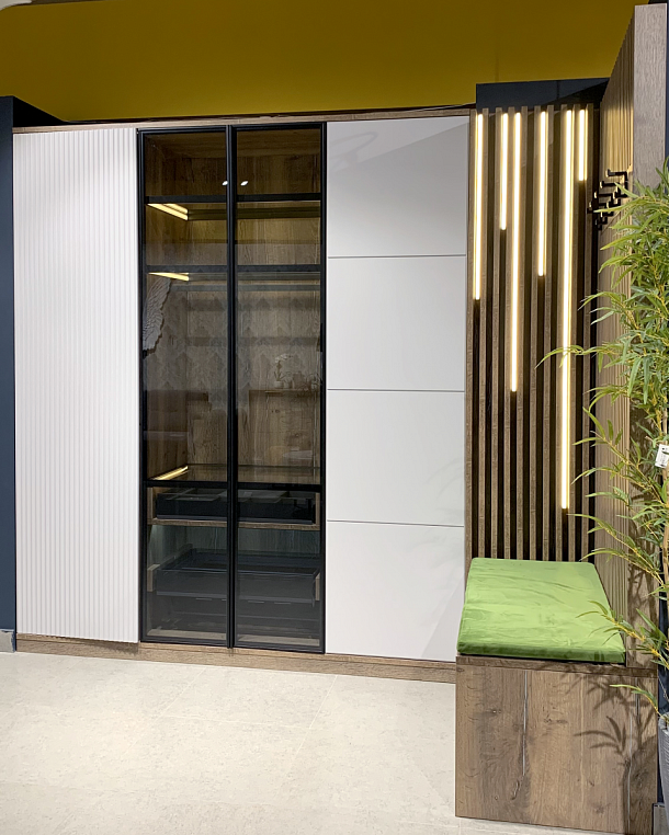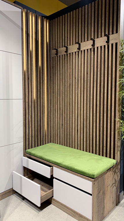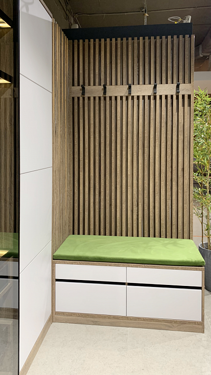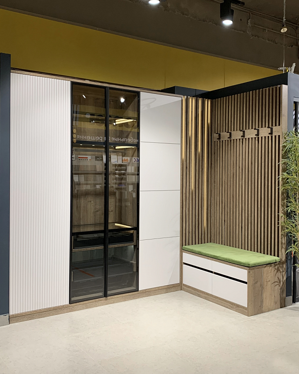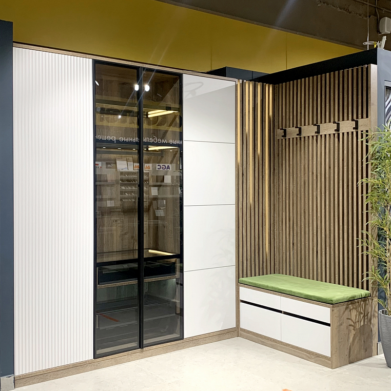 Невероятная прихожая с рейками и распашными фасадами. Здесь предусмотрено все: - рейки с подсветкой и крючками, на которые удобно расположить верхнюю одежу для ежедневного использования; - мягкий элемент, который не только придает изделию яркости, но и является функциональным дополнением. Здесь можно удобно расположиться, чтобы обуть/снять обувь; под мягким элементом расположены ящики для мелочей и обувницы; - за распашными фасадами достаточно места для хранения одежды, обуви и аксессуаров, функциональность и комфорт в использовании обеспечивает выдвижная фурнитура - ящик Matrix с лотком-органайзером для украшений и аксессуаров, обувница Matrix, телескопический держатель, вешало для плечиков с потолочным креплением, обувница, брючница наборного типа. Комбинированные фасады (МДФ эмаль и прозрачное стекло с защитной пленкой) придают изделию определенный стиль и шарм. Угловая прихожая с мягким элементом и рейками - это стильное и функциональное решение для оформления входной зоны в вашем доме. Такая мебель не только обеспечит удобное хранение верхней одежды, обуви и аксессуаров, но и станет ярким акцентом в интерьере. Мягкий элемент в виде пуфа или банкетки позволит комфортно обуваться, а рейки добавят прихожей легкости и изысканности. Угловая форма прихожей позволит максимально эффективно использовать пространство в углах комнаты, а также создаст дополнительное место для хранения вещей. При выборе материалов для такой прихожей стоит обратить внимание на сочетание дерева, металла и кожи или ткани. Дерево придаст мебели теплоту и натуральность, металл - прочность и долговечность, а кожа или ткань - мягкость и уют. Не забудьте про освещение - угловой прихожей не помешает дополнительная подсветка, которая подчеркнет ее дизайн и сделает процесс одевания более комфортным. *Указана минимальная стоимость изделия без учета стоимости услуг.