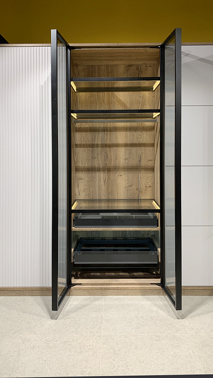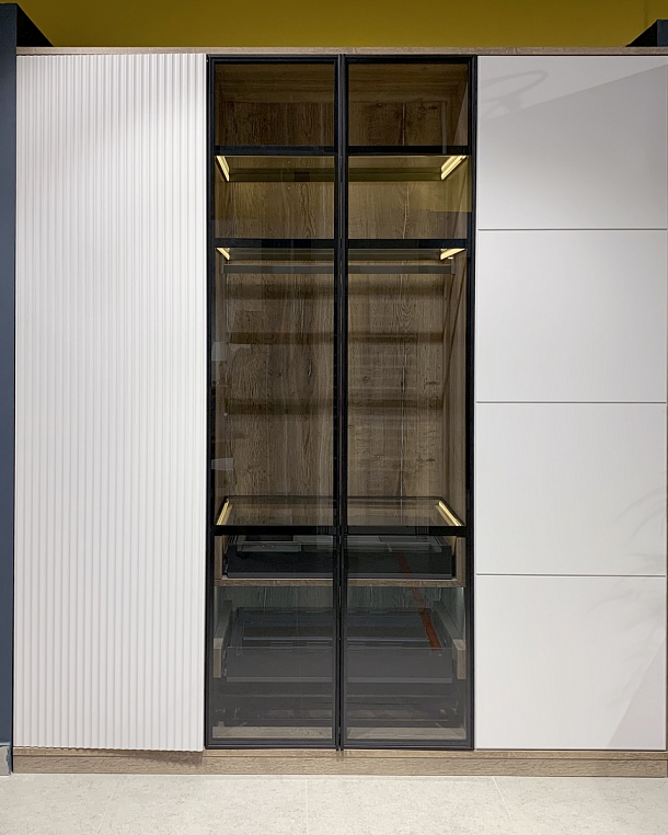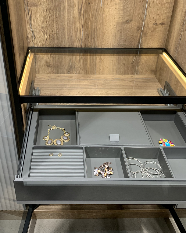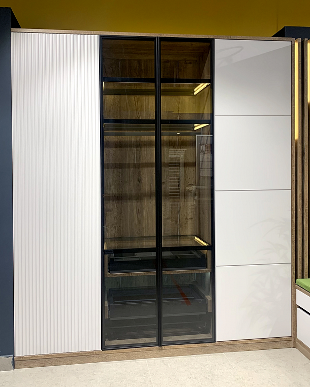 Внутреннее наполнение: Выдвижной ящик Matrix с лотком-органайзером для украшений и аксессуаров, выдвижная обувница Matrix, выдвижной телескопический держатель, вешало для плечиков с потолочным креплением, выдвижная обувница, выдвижная брючница наборного типа, подсветка