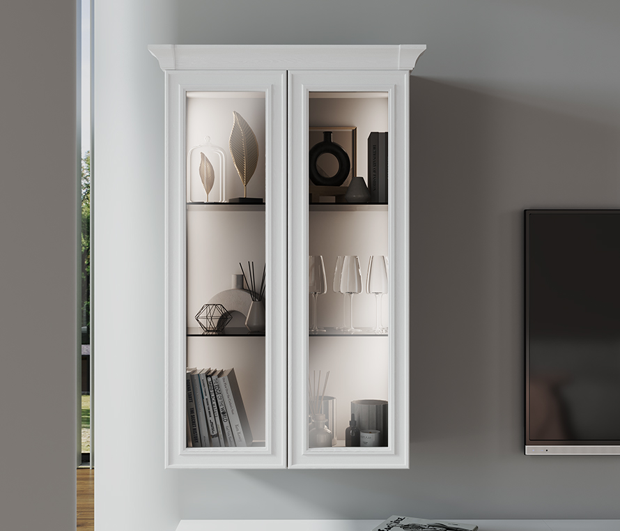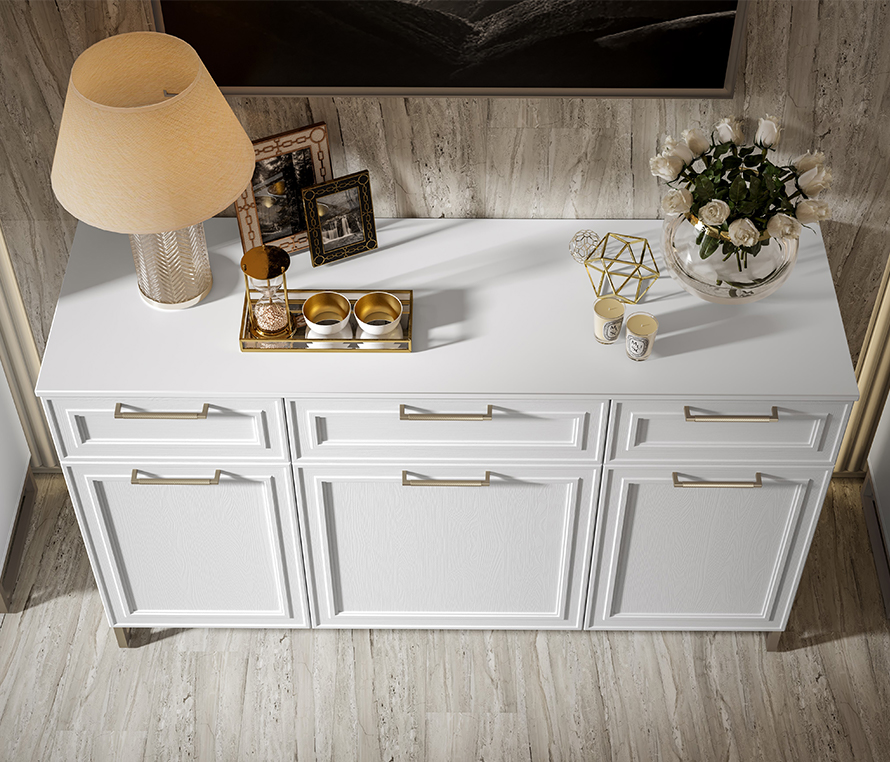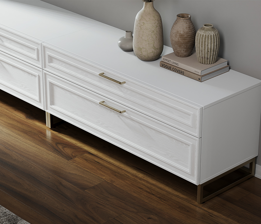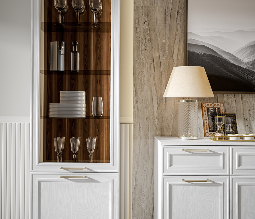 Белоснежная гостиная с нотками тонкого манерного золота соберет восхищенные взгляды гостей. Компаньон из древесной текстуры Зейдан оттеняет фасады, делая композицию завершенной.