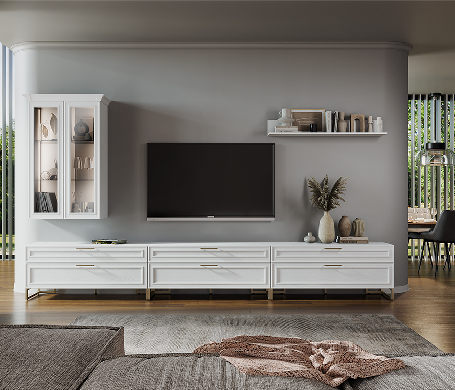 Технологичная ТВ зона, модули с сенсорной подсветкой и декоративный профиль из МДФ станут успешной коллаборацией неоклассики и технологий в пространстве гостиной.