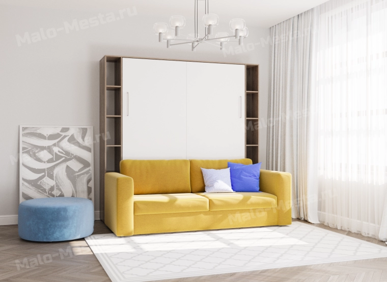 Умная кровать-трансформер Camelia оснащена откидной кроватью, диваном с местом для хранения, шкафом для кровати и пеналами с открытыми полками по бокам шкафа.Корпус дивана собран из ЛДСП, имеет место для хранения и подушки сиденья на липучках. Кровать раскладывается за ручки на фасаде и опускается на перекидная опору, эконом-вариант опоры в ассортименте ТМ «Мало места».Шкаф для кровати оснащен ребром жёсткости, стенки у шкафа нет. Открытые полки в пеналах по бокам кровати Camelia позволяют видеть, что где лежит.