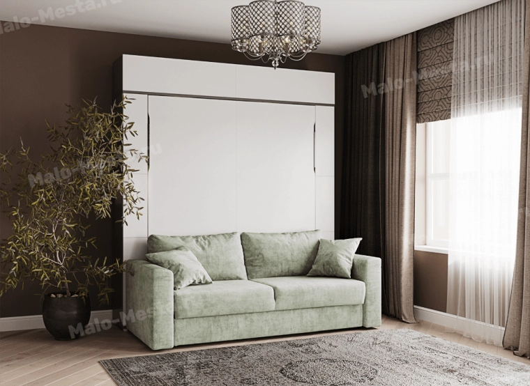 Откидная кровать Galaxy с диваном имеет все необходимое для комфортной жизни: трансформируемая кровать, диван с механизмом «дельфин», шкаф для кровати с задней стенкой, пеналы с закрытыми полками по бокам шкафа.«База» кровати-трансформера – стальная рама основания под матрас и механизм трансформации из стальных элементов.Диван Galaxy оснащен механизмом трансформации «дельфин», что позволяет быстро убирать сиденье в ящик.Шкаф-кровать Galaxy предоставляет возможность выбирать опору для кровати в разложенном положении: перекидная опора или выпадающие ножки. Обе опоры выполнены из стали и имеют идентичную надёжность. Варианты опоры дают возможность выбрать то, как будет выглядеть фасад будущей кровати-трансформера.Подъемная кровать с перекидной опорой имеет ручки на фасаде для открытия. Выпадающие ножки подразумевают гладкий фасад без ручек, открытие осуществляется за одну из ножек, но выпадающие ножки требуют вырезов по бокам фасада, за которым размещена кровать с матрасом. Выбор опоры зависит от интересов, пожеланий и будущего интерьера.Шкаф для кровати оснащен задней стенкой, на которую возможна установка мягкого изголовья различной модификации (вариант изголовья можно выбрать в блоке Дополнительных опций).Galaxy – одна из немногих моделей в ассортименте ТМ «Мало места», которая имеет открытые полки с доступом со стороны кровати. В качестве дополнения на открытых полках возможна установка розетки для зарядки гаджетов, светильников с выключателями (смотрите пакеты в блоке Дополнительных опций). Эти полки закрыты дверцами со стороны фасада.