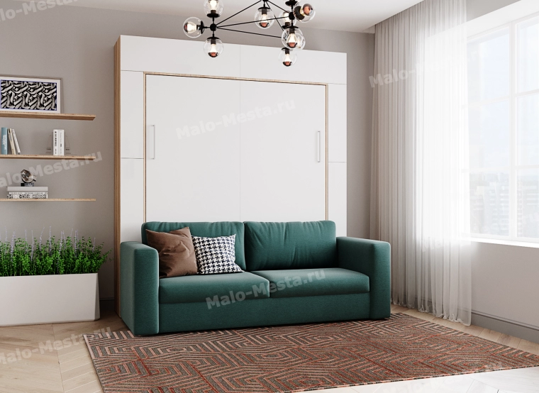 Шкаф-кровать-диван Steady – это модель кроватей-трансформеров эконом-сегмента ТМ «Мало места» с расширенной комплектацией.В комплекте есть раскладывающаяся от стены кровать, диван с местом для хранения, шкаф, боковые пеналы с дверцами и антресоль над шкафом.Основа кровати-трансформера – стальная рама основания для матраса с ламелями и механизм трансформации, состоящий из стальных элементов. Опора для кровати – перекидная, она позволяет сохранять стоимость кровати в комфортном диапазоне эконом-класса. Ручки на фасаде для раскладывания кровати.Шкаф для «хранения» кровати изготавливается без задней стенки, но с ребром жёсткости для фиксации конструкции. Закрытые пеналы по бокам от шкафа и антресоль с двумя отделениями и дверцами.