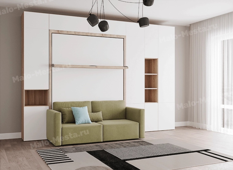 Кровать-трансформер с диваном Veritas – это минимально необходимый комплект мебели для малогабаритной квартиры. В состав мебели-трансформера входит откидная кровать, шкаф для кровати и диван с дополнительным место для хранения.В базе кровать оснащена стальной рамой основания для матраса и стальными деталями механизма трансформации.Опора откидной от стены кровати – ножка-полка, которая имеет стальные упоры по бокам и перекладину из ЛДСП толщиной 32 мм для усиления. Открытие кровати осуществляется за ручку на ножке-полке. Полка-нога уравновешена таким образом, что все вещи остаются на ней при открытии и закрытии кровати.Шкаф для "хранения" кровати оснащен задней стенкой, что позволяет установить любое мягкое изголовье (выбрать можно в блоке "Дополнительных опций"), и утолщенным до 44 мм корпусом.Диван серии Prestige имеет внутренние отделения для хранения вещей. Получить доступ к ящику в диване можно, подняв одну или все секции сидений дивана.Отличительной особенностью дивана кровати-трансформера Veritas являются уменьшенные подлокотники до 150 мм, что позволяет вписать кровать даже в очень узкую нишу.