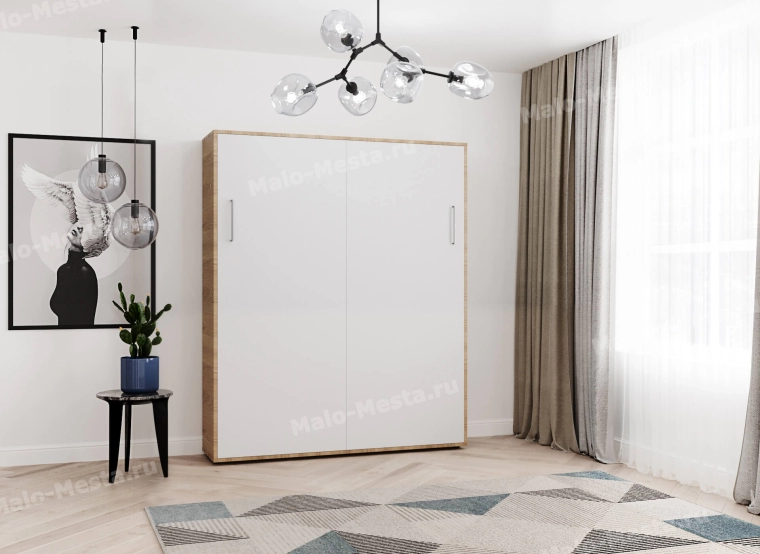Кровать-стенка без дивана Stels – это спрятанная в шкаф кровать с минимальной комплектацией: откидная от стены кровать и шкаф для нее.В базе у Stels стальная рама основания для матраса и механизм трансформации на стальных деталях.Шкаф для кровати имеет заднюю стенку для установки различных вариантов мягкого изголовья (варианты мягкого изголовья смотрите в "Дополнительных опциях").Для встроенной кровати Stels можно выбрать одну из двух опор: перекидная опора из стали, полностью прячется в шкаф вместе с кроватью в закрытом виде, кровать с перекидной опорой требует ручек на фасаде для открывания. Второй вариант опоры – выпадающие стальные ножки, которые крепятся к раме основания матраса. Открытие сложенной кровати осуществляется за одну из ножек. Для выпадающих ножек необходимы вырезы на фасаде по бокам.