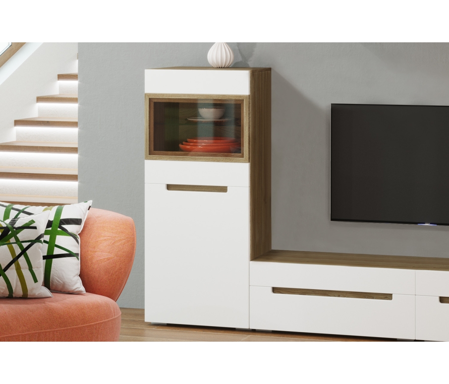 Характеристики:Напольный шкаф многоцелевого назначения;Цвет корпуса: швейцарский вяз;Цвет фасадов: белый матовый;Отделение за стеклом укомплектовано стеклянной полкой, за глухим фасадом — полка из ЛДСП;Необходимо крепление шкафа к стене во избежание опрокидывания при открывании дверей (в фурнитуре для этого есть крепежный уголок);Ставить к стене вплотную можно только при отсутствии плинтуса (нет спила под плинтус);Не предназначен для установки телевизора на верхнюю крышку (если вес его более 5-8 кг);Дополнительно шкаф можно укомплектовать подсветкой полок ПС-600 или ПС(Т1)-2 подсветка точечная.Материалы:Корпус: ЛДСП 16 мм;Фасады: профиль МДФ 19 мм в пленке ПВХ, вставка — стекло Stopsol бронза;Задняя стенка: ДВП в цвет каркаса;Для облицовывания кромок деталей используется высококачественный материал от ключевых производителей;Пластиковые нерегулируемые опоры высотой 2 см;Крепежная фурнитура и механизмы ведущих производителей;Петли с доводчиками.