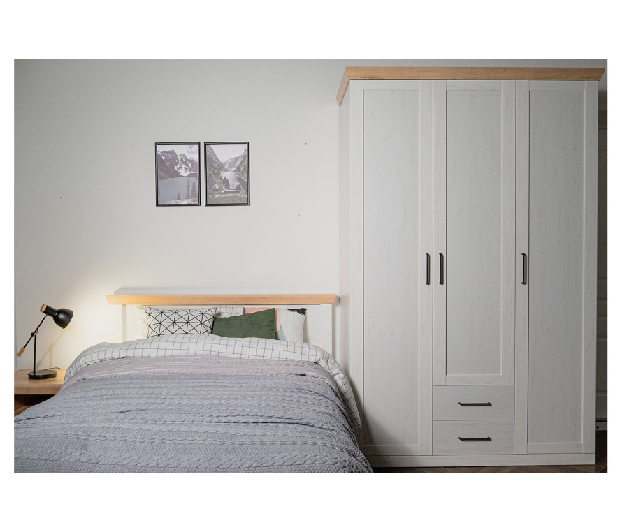 Удобный трехстворчатый платяной шкаф поможет разместить все необходимое, начиная от текстиля и аксессуаров и заканчивая одеждой на вешалках. Практичный оттенок блан-шене, разбавленный теплым древесным цветом дуб бунратти, идеально впишется в любое светлое помещение в стиле сканди, фьюжн, классика или минимализм.Конструкция состоит из трех отделений: центральный отсек занят полками и двумя ящиками, два боковых включают в себя верхнюю полочку и секцию со встроенной штангой. По запросу покупателя комплектация может быть изменена. Лаконичный цоколь скрывает регулируемые опоры, верхнюю часть модели украшает стильный карниз. Распашные фасады и выдвижные модули декорированы контрастными черными ручками-скобами, для средней двери возможен право- и левосторонний вариант навешивания. Петли с доводчиками и скрытые направляющие с демпферами гарантируют приятную эксплуатацию мебели.Характеристики:Цвет: блан-шене, дуб бунратти;В средней секции вверху отделение с полками ЛДСП, с распашными рамочными дверьми (вставка двери — ЛДСП 8 мм), внизу — два выдвижных ящика на направляющих скрытого монтажа со встроенным доводчиком;Фасады ящиков — ЛДСП 22 мм;Максимальная нагрузка в ящик — не более 6 кг;Цвет корпуса и фасадов: дуб бунратти;Средняя дверь может навешиваться на правую и левую сторону;В правой и левой секциях шкафа установлены штанги для одежды;В левую и правую секции шкафа можно установить дополнительно по 4 полки ЛДСП (4 модуля МГ-009.00);Отдельно стоящий шкаф необходимо крепить к стене во избежание опрокидывания.