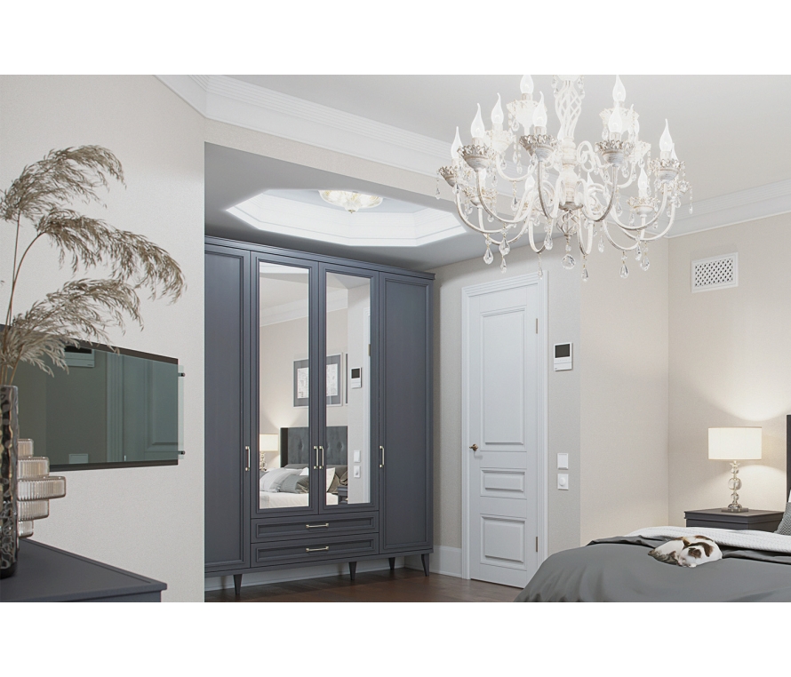 Характеристики:Шкаф 4-створчатый с центральными зеркальными фасадами, 2 боковыми глухими фасадами и 2 выдвижными ящиками;Можно доукомплектовать полками ОР-011.07 (1шт);В базовый комплект входит штанга, 8 полок ЛДСП и антресольная полка;Максимальная распределенная нагрузка для выдвижных ящиков на дно — 4-7 кг (на верхние ящики — не более 4 кг), при этом нагрузка должна быть распределена по всему дну (не класть тяжелые предметы, которые могут повредить и выдавить дно).Материалы:Корпус: ЛДСП 16 мм;Фасады: рамочные со вставками из ЛДСП 6 мм и зеркало 4 мм;Задняя стенка: ДВП;Опоры: буковые;В выдвижных ящиках используются направляющие скрытого монтажа со встроенным доводчиком;Крепежная фурнитура и механизмы ведущих производителей.