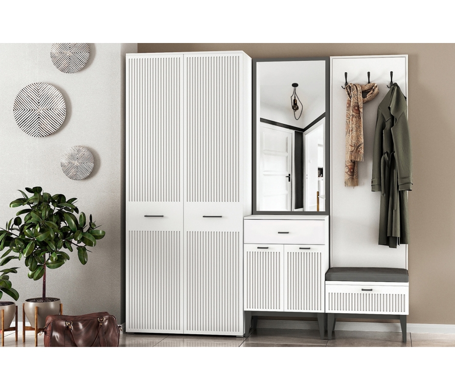 Оригинальный дизайн подходит для прихожей, гостиной или спальни в стиле ар-деко. Необычные фрезерованные поверхности цвета «белый премиум» в сочетании с черными матовыми ручками привлекают к себе внимание с первого взгляда. Глухие фасады снабжены распашным механизмом с доводчиками, что обеспечивает мягкое, плавное движение петель. Внутри изделие состоит из двух основных отсеков: узкого отделения с полками и просторной секции для одежды с полкой-антресолью и выдвижной штангой. Регулируемые по высоте ножки позволяют устанавливать мебель даже на неровное покрытие.Модель изготовлена из ЛДСП и экологичной древесной плиты, окутанной ПВХ-пленкой. Металлическая фурнитура бренда Makmart гарантирует удобную эксплуатацию и продолжительный срок службы меблировки. Вы можете заказать «Хилтон» через интернет-магазин «Ангстрем» с адресной доставкой, сборкой и установкой. В одноименной коллекции найдутся также другие шкафы, комоды, тумбы в соответствующем оформлении.Характеристики:Цвет: белый премиум;Цвет ручек: чёрный матовый;Наполнение шкафа: отделение для одежды с выдвижной штангой и полкой над ней, узкое отделение с полками;Шкаф установлен на опорах, регулируемых по высоте.Материалы:Каркас: ЛДСП 16 мм;Фасады: МДФ с фрезеровкой и окутаны плёнкой ПВХ;Фасады укомплектованы петлями МакМарт с доводчиками;Ручки: металл.