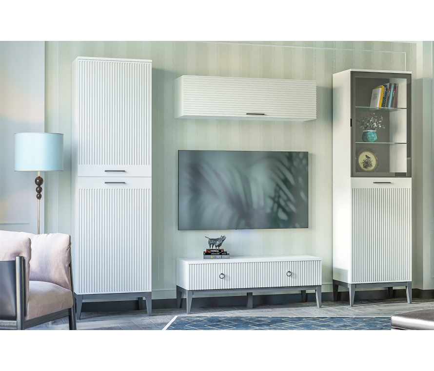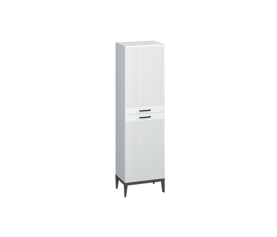 Характеристики:Цвет: белый премиум;Цвет ручек: чёрный матовый;Наполнение шкафа: верхний отдел с двумя полками и нижний отдел с двумя полками из ЛДСП.Материалы:Каркас: ЛДСП 16 мм;Фасады: МДФ с фрезеровкой, окутаны плёнкой ПВХ;Ручки: металл;Опоры: деревянные с эмалевой отделкой серого цвета;Фасады укомплектованы петлями МакМарт с доводчиками.