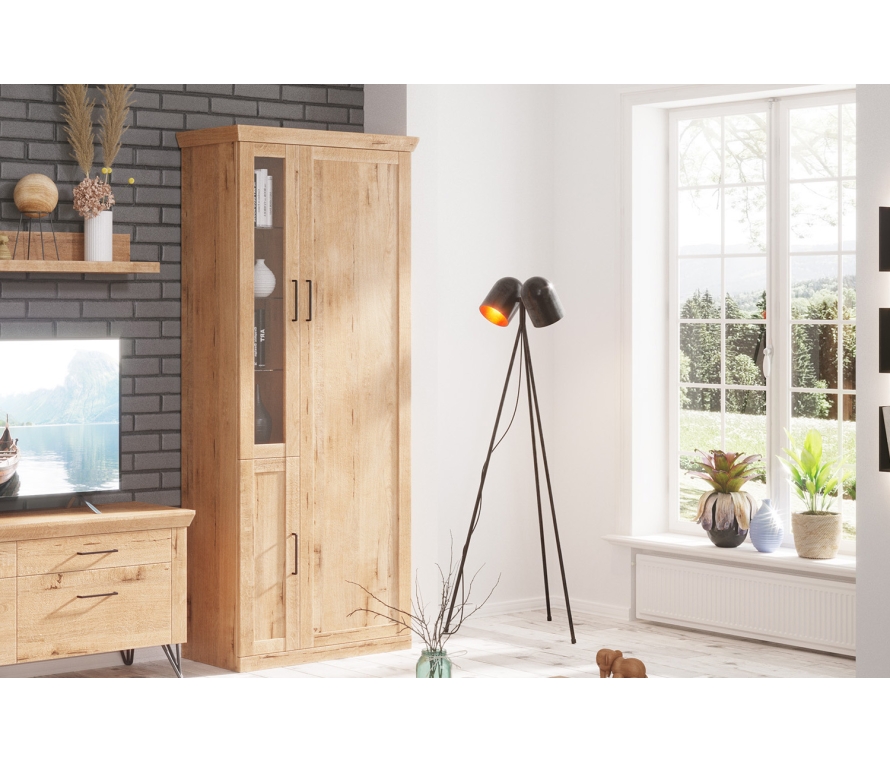 Характеристики:Шкаф трехдверный с вертикальной перегородкой, разделяющей шкаф на два отделения (одно — под одежду с выдвижной штангой, другое — с полками ЛДСП и стеклополками);Дизайн «Д1» (с проходными боками, на регулируемых скрытых опорах);Отделения при сборке можно поменять местами;В отделение под одежду можно установить дополнительно 4 полки ЛДСП (2 модуля МГ-002.00);Фасады рамочные (два фасада — со вставкой ЛДСП 8 мм, один — со вставкой стекло прозрачное 4 мм);Цвет ЛДСП и фасадов: дуб бунратти;Цвет профиля на крышке: дуб бунратти;Цвет задней стенки ДВП: черный графит;Отдельно стоящий шкаф необходимо крепить к стене во избежание опрокидывания;За стеклянными полками можно дополнительно установить подсветку ПС-450 мм (потребуется самостоятельно урезать подсветку по ширине).