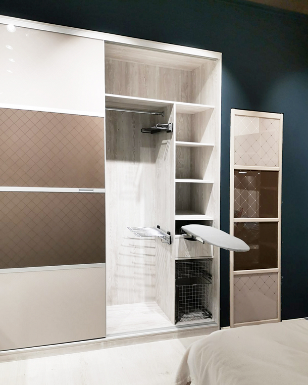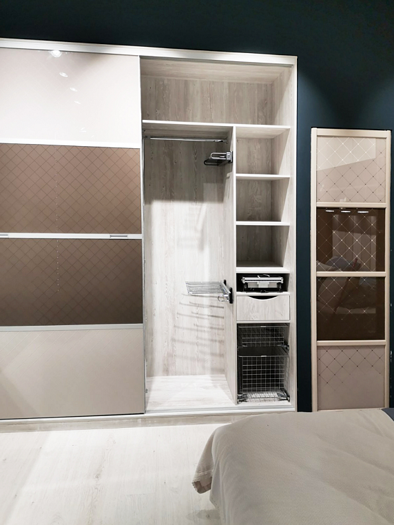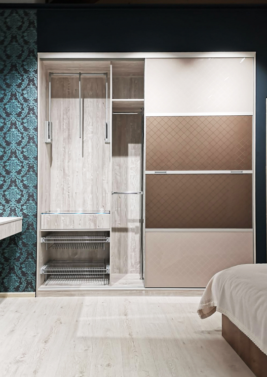 Фасад изделия - немецкая профильная система S800 (Raumplus Германия), наполнение - стекло "Кашемир", "Трюфель" с пескоструйным рисунком в виде ромбов. Корпус изделия выполнен из ЛДСП Egger в цвете "Сосна касцина" Внутреннее наполнение шкафа - вешало для брюк, вешало для галстуков, пантограф, корзины для обуви, светодиодный светильник-клипса для полки, гладильная доска *Указана стоимомть изделия в минимальной комплектации без учета стоимости услуг.