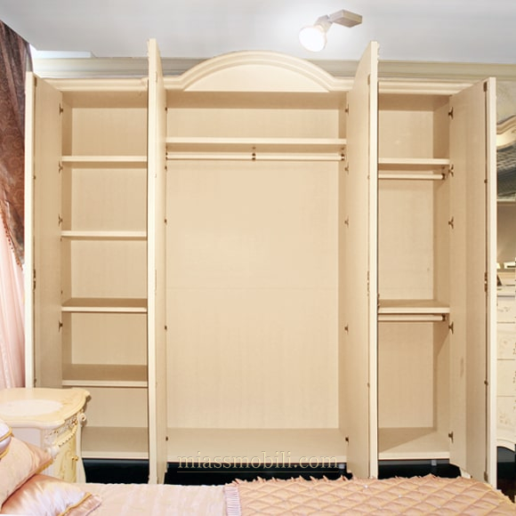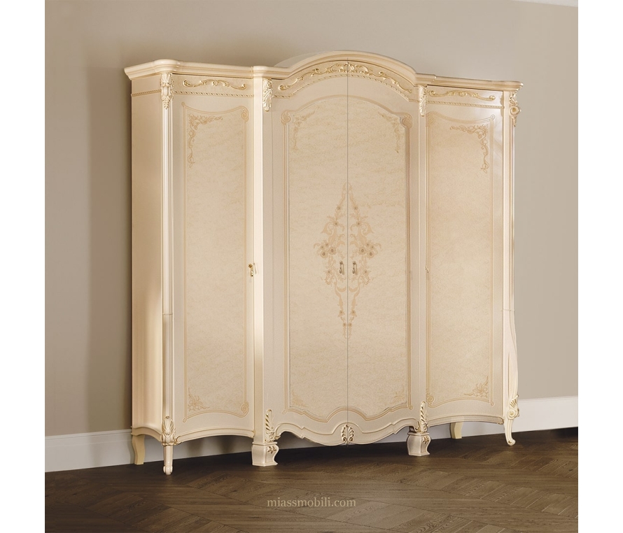 Шкаф 4-х дверный из набора мебели для спальни Престиж. Фасад украшен декоративными элементами и ручной художественной росписью. В левой части шкафа установлены четыре полки, в правой части сверху и посередине также установлены штанги c полками. В центральной части шкафа расположена полка и штанга для хранения верхней одежды.Габаритный размер указан по выступающим частям изделия.Выполняется под заказ.