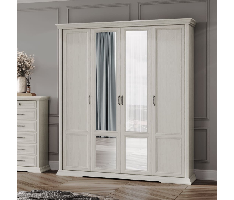 Шкаф 4-х дверный с зеркалом. В центральной части шкафа находятся две полки: полка со штангой и нижняя полка. По бокам отделения наполнены полками, дополнительно имеется одна полка со штангой.