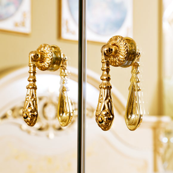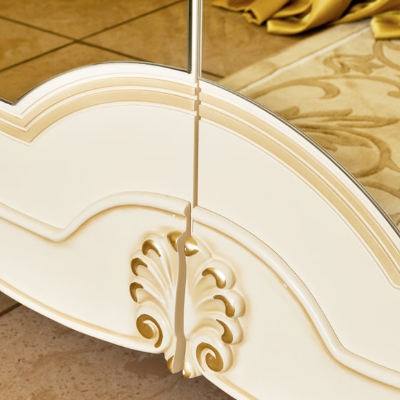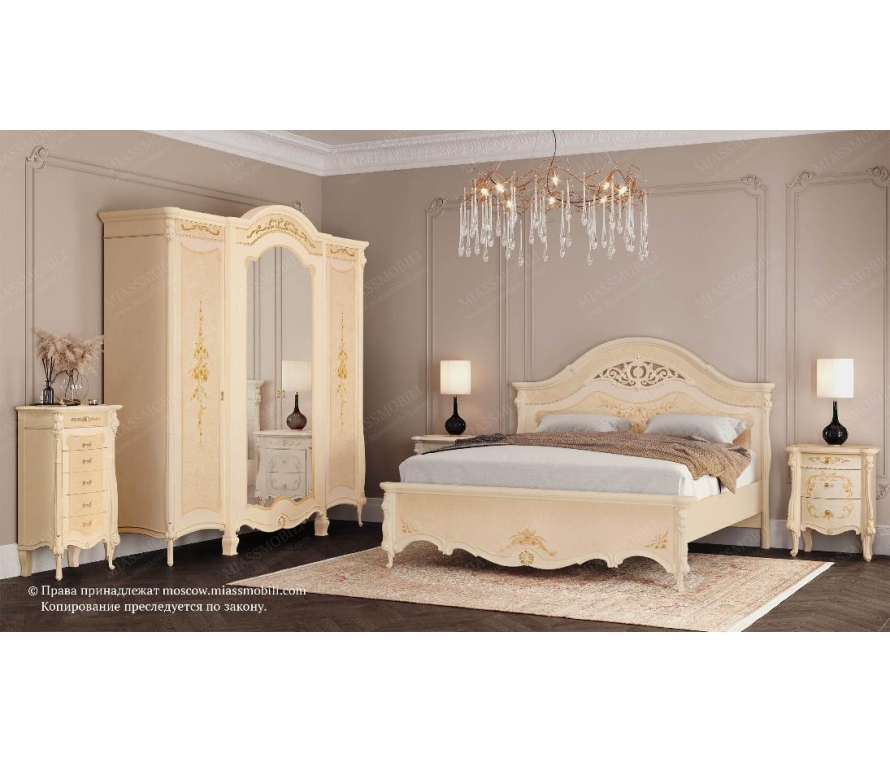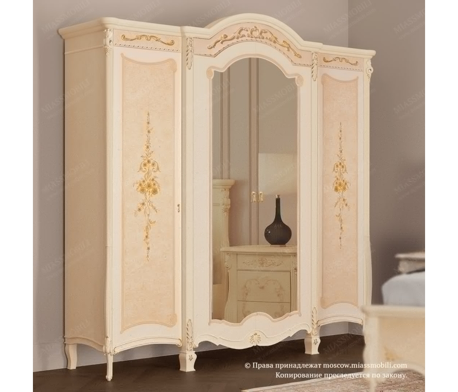 Фасад шкафа 4-дверного украшен резными декоративными элементами и ручной художественной росписью. В левой части шкафа установлены четыре полки, в правой части сверху и посередине установлены штанги c полками. В центральной части шкафа расположена полка и штанга для хранения верхней одежды.Габаритный размер указан по максимально выступающим частям изделия.Выполняется под заказ.