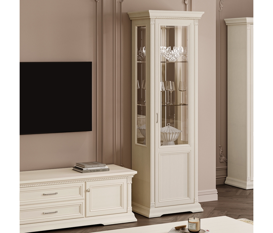Однодверная витрина для посуды. В изделии используется шпон и массив ясеня. Внутри витрины установлены стеклянные полки и внутренняя подсветка. Задняя стенка витрины зеркальная. Стекла с фацетом. Габаритный размер указан по максимально выступающим частям изделия.