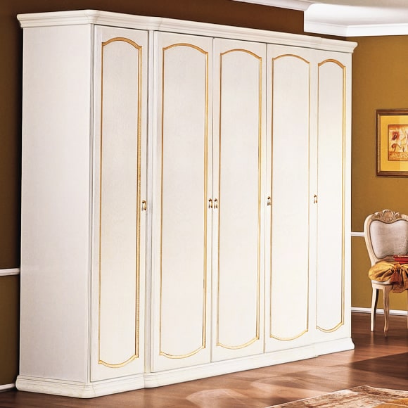 Шкаф 5-дверный без зеркал выполнен с использованием массива и шпона дуба в отделке декапе. Левая часть шкафа оборудована полками и штангами. Центральная часть изделия имеет два отделения, в которых установлены полки со штангами для хранения верхней одежды. В правой части шкафа расположены полки.Габаритный размер указан по максимально выступающим частям изделия.