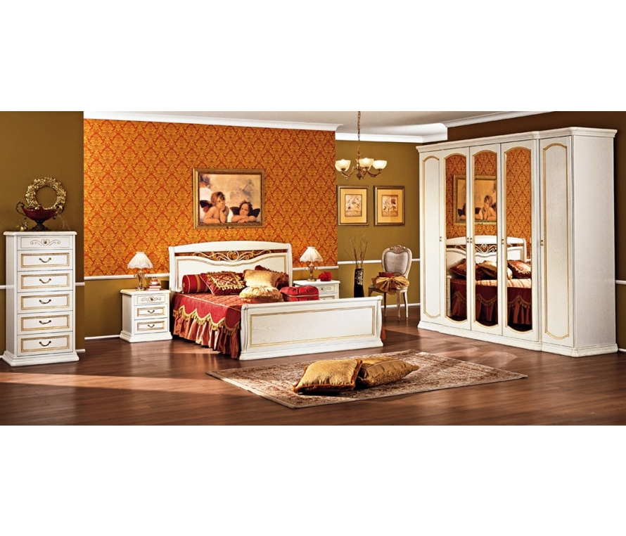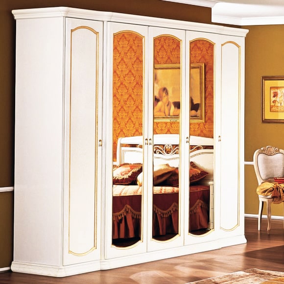 Шкаф 5-дверный с зеркалами выполнен с использованием массива и шпона дуба в отделке декапе. Левая часть шкафа оборудована полками и штангами. Центральная часть изделия имеет два отделения, в которых установлены полки со штангами для хранения верхней одежды. В правой части шкафа расположены полки.Габаритный размер указан по максимально выступающим частям изделия.