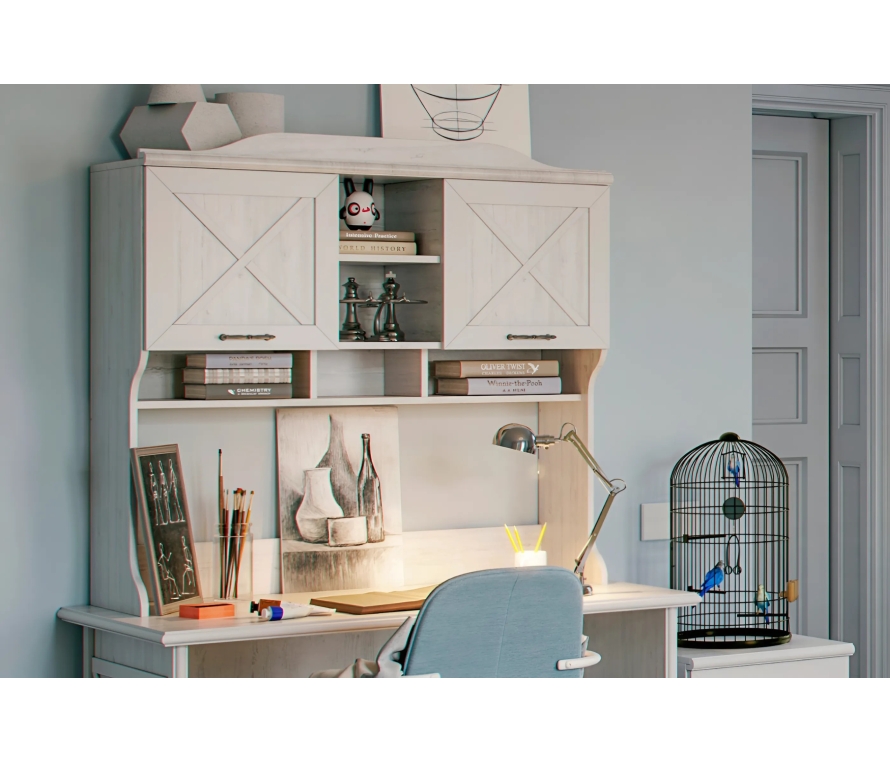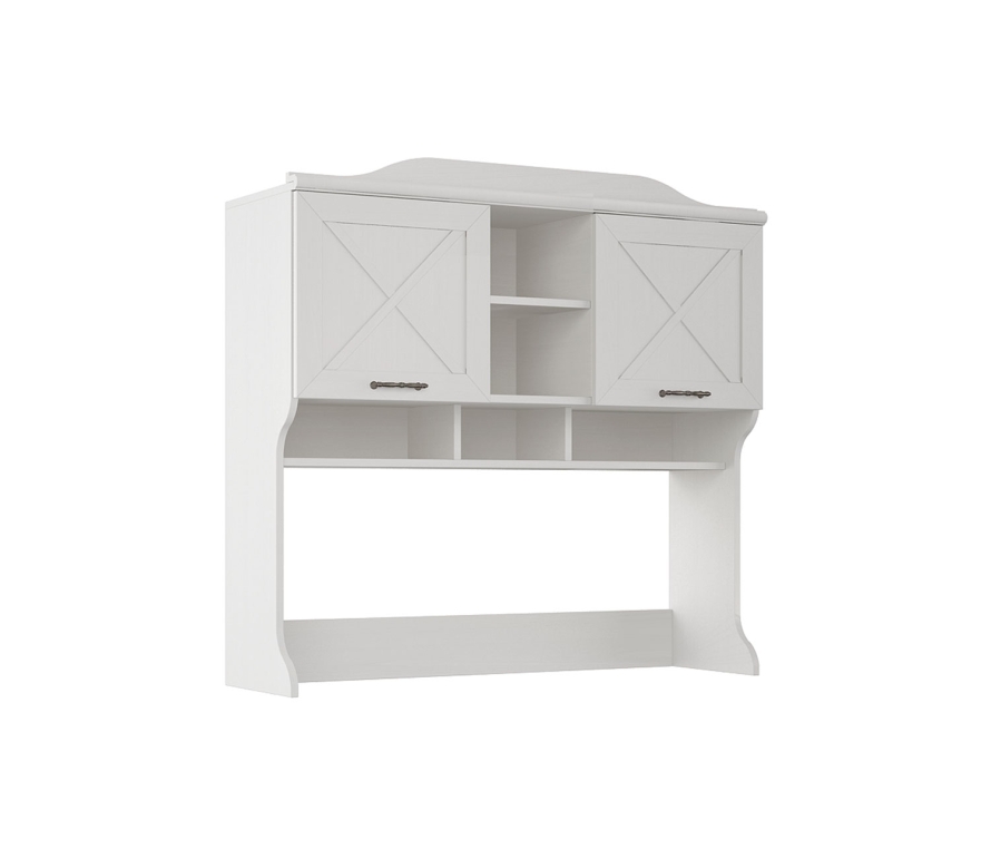 Характеристики:Стеллаж-надстройка для стола Кантри КА-504.09;Цвет: блан шене;Цвет лицевой фурнитуры (ручек и декоративных петель): античное железо.Материалы:Корпус: ЛДСП;Фасады: с декоративными элементами — фахверками из композитного материала и декоративными профилями из МДФ;Крепежная фурнитура и механизмы ведущих производителей.