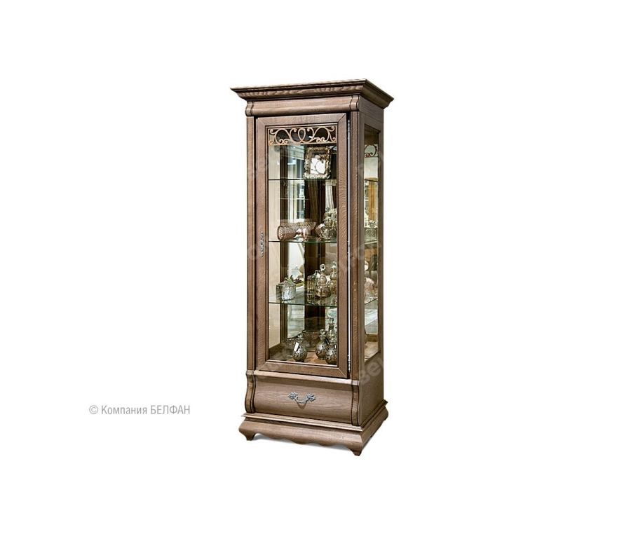 Сделанный из массива дуба однодверный шкаф с витриной «Оскар» (Oskar) демонстрирует ясные гармоничные пропорции, при этом его вид достаточно компактен. Благодаря внутренней подсветке помещенные в шкаф изысканные сервизы заиграют всеми гранями, а на фоне деликатного велюра, которым обита внутренняя поверхность ящиков, сиянье столовых приборов станет еще ярче. Разнообразие расцветок («амбэр с белой патиной», «классик» или «белая эмаль») позволят подобрать наилучший вариант для гостиной, кухни или столовой. Для того, чтобы оптимально разместить шкаф с витриной в вашем интерьере, выберите нужное вам исполнение (правое или левое). Особенности однодверного правого шкафа с витриной «Оскар»: ? Внутренняя подсветка. ? Вместительный ящик с направляющими (пр-ва Австрии) полного выдвижения и бесшумного закрывания. ? В ящике для деликатных вещей дно отделано велюром. Цвет ткани может разниться в зависимости от изделия. ? Вы сможете не волноваться за посуду, потому что дверца плотно закрывается на ключ и пыль не попадает внутрь. ? Деревянная накладная резьба на стеклянной двери. ? Боковые стекла с фацетом. ? Три стеклянных полки регулируемые по высоте. ? Задняя зеркальная стенка. ? Гнутый карниз и фасад выдвижного ящика. ? Фигурный цоколь в виде «волны». ? Итальянская лицевая фурнитура. ? Возможно левое (петли слева) или правое исполнение (петли справа). ? Экологичное покрытие - окрашено краской и лаком на водной основе.