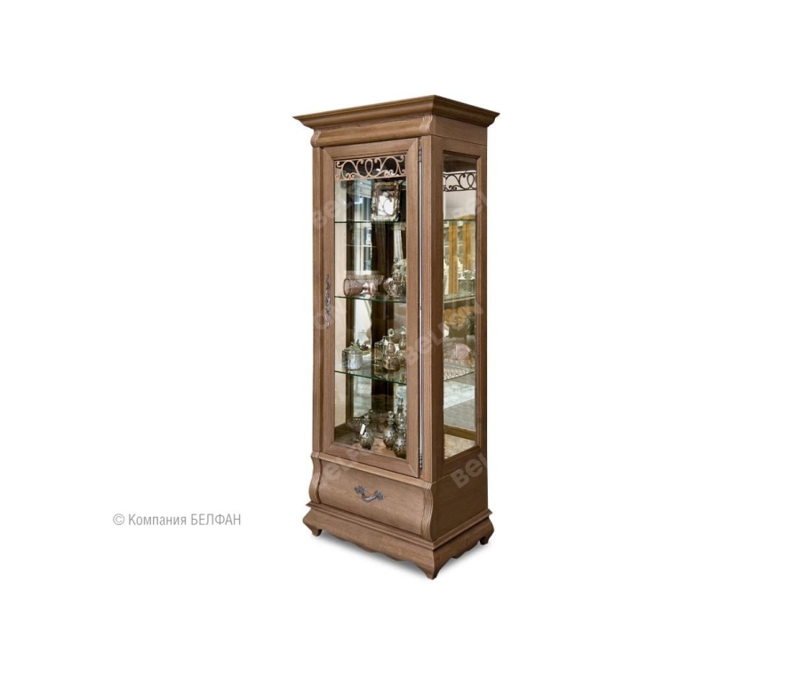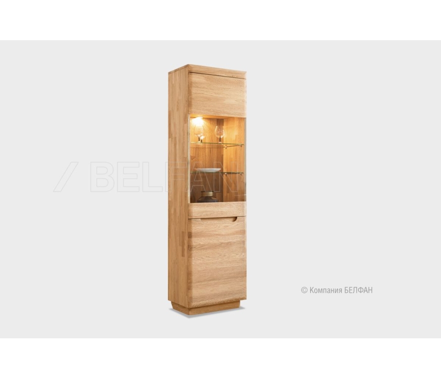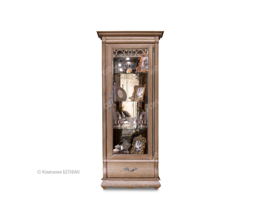 Сделанный из массива дуба однодверный шкаф с витриной «Оскар» (Oskar) демонстрирует ясные гармоничные пропорции, при этом его вид достаточно компактен. Благодаря внутренней подсветке помещенные в шкаф изысканные сервизы заиграют всеми гранями, а на фоне деликатного велюра, которым обита внутренняя поверхность ящиков, сиянье столовых приборов станет еще ярче. Разнообразие расцветок («амбэр с белой патиной», «классик» или «белая эмаль») позволят подобрать наилучший вариант для гостиной, кухни или столовой. Для того, чтобы оптимально разместить шкаф с витриной в вашем интерьере, выберите нужное вам исполнение (правое или левое). Особенности однодверного правого шкафа с витриной «Оскар»: ? Внутренняя подсветка. ? Вместительный ящик с направляющими (пр-ва Австрии) полного выдвижения и бесшумного закрывания. ? В ящике для деликатных вещей дно отделано велюром. Цвет ткани может разниться в зависимости от изделия. ? Вы сможете не волноваться за посуду, потому что дверца плотно закрывается на ключ и пыль не попадает внутрь. ? Деревянная накладная резьба на стеклянной двери. ? Боковые стекла с фацетом. ? Три стеклянных полки регулируемые по высоте. ? Задняя зеркальная стенка. ? Гнутый карниз и фасад выдвижного ящика. ? Фигурный цоколь в виде «волны». ? Итальянская лицевая фурнитура. ? Возможно левое (петли слева) или правое исполнение (петли справа). ? Экологичное покрытие - окрашено краской и лаком на водной основе.