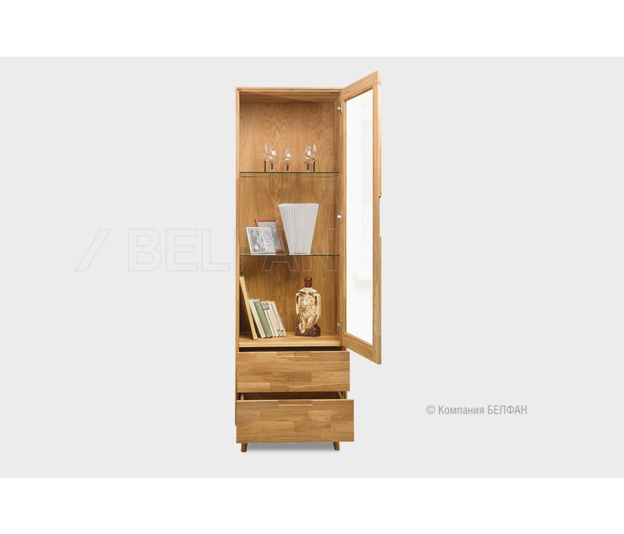 Коллекция мебели «Ирвинг» создана в стиле Mid-century modern, который сочетает простоту форм, функциональность и визуальную лёгкость. Это мебель, которая не перегружает пространство, но при этом задаёт настроение: тёплое, уверенное, элегантное. Шкаф с витриной 1-но дверный «Ирвинг» (правый) - это витрина вашей индивидуальности. Лаконичный корпус на высоких скошенных ножках создаёт эффект парящей лёгкости. Прямая вертикаль и точные пропорции позволяют вписать шкаф даже в небольшие пространства. Прозрачная дверь на всю высоту делает его не только функциональным, но и выразительным элементом интерьера. Функциональные особенности ? Размеры - ширина 600 мм, высота 1950 мм, глубина 450 мм. ? Верхняя секция - за распашной дверью две стеклянные полки (максимальная нагрузка на полку 6кг), отлично подходит для предметов декора, сервиза или посуды. ? Нижняя секция - два вместительных ящика с плавным выдвижением, выдерживающие нагрузку до 20 кг каждый. Подходят для хранения текстиля, журналов, бумаги или личных вещей. ? Три варианта крашения: «беленый дуб», «графит», «бейц-масло». Экологичность и материалы ? Витрина изготовлена из 100% массива дуба - прочного и по-настоящему живого материала. ? Натуральный дуб пропитан экологичным бейц-маслом европейского производства, которое подчёркивает текстуру дуба и сохраняет его естественную красоту. В интерьере Шкаф с витриной «Ирвинг» благодаря универсальному дизайну и натуральному дереву легко встраивается как в скандинавский, так и в современный, эклектичный интерьер. Подчеркните его тёплый характер зелёными растениями, книгами или предметами ручной работы. Рекомендации по сочетанию ? Прекрасно смотрится в составе одноимённой коллекции — рядом с ТВ-тумбой, комодом или консолью. ? Для визуального баланса разместите шкаф у стены, а рядом — светильник с текстильным абажуром или мягкое кресло. ? В интерьере с тёмным полом эффектно будет смотреться светлый белёный дуб, а с белыми стенами — графитовый оттенок. ? Витрину можно использовать и в гостиной, и в домашнем кабинете. Рекомендации от BELFAN: Мы рекомендуем воспользоваться услугой профессиональной сборки от BELFAN — чтобы сохранить гарантию и быть уверенными в точной установке всех элементов. Мебель из массива дерева необыкновенно красива, добротна и славится своим долголетием. Однако, чтобы продлить этот срок, сохранить мебельным изделиям первоначальную элегантность и отличный внешний вид, за ней необходим надлежащий уход. Если у вас появились царапины, следы от кружки или мокрой тряпки, то сервис-бокс от компании BELFAN поможет вам вернуть мебели первозданный вид даже в домашних условиях. Данный сервис-бокс подходит только для мебели в крашении бейц-масло. Скачать схему сборки витрины: Видеообзор гостиная Ирвинг