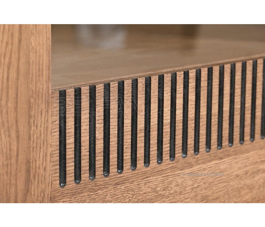 Особенности правой однодверной витрины «Bergamo» (Бергамо): ? Сочетание самых последних трендов современной мебельной моды. ? Мягкие плавные линии обраченные в минималистичность форм придадут интерьеру эстетичность. ? Высокие изящные ножки в сочетании с утопленными столешницами изделий создают эффект пространственной легкости. ? Цельные скруглённые стойки, переходящие в боковины, придают каждому изделию особое изящество, делая предметы цельными и утонченными. ? Яркий тренд мебельной моды – глянцевая стеклянная столешница с высочайшим качеством печати, имитирующая рисунок темного мрамора ? Сложная геометрическая фрезеровка на фасадах имитирует стекающую лаву, подчеркивая уникальность дизайнерской мысли. ? Яркий рисунок благородного дуба подчеркивает натуральность и индивидуальность изделия. ? 100% массив дуба. ? Изделия покрыты высокопрочным итальянским паркетным маслом «Borma». Покрытие позволяет подчеркнуть красоту натурального дуба, оно придает поверхности твердость, повышает водостойкость и износостойкость, изделие не темнеет со временем. Схема витрины: