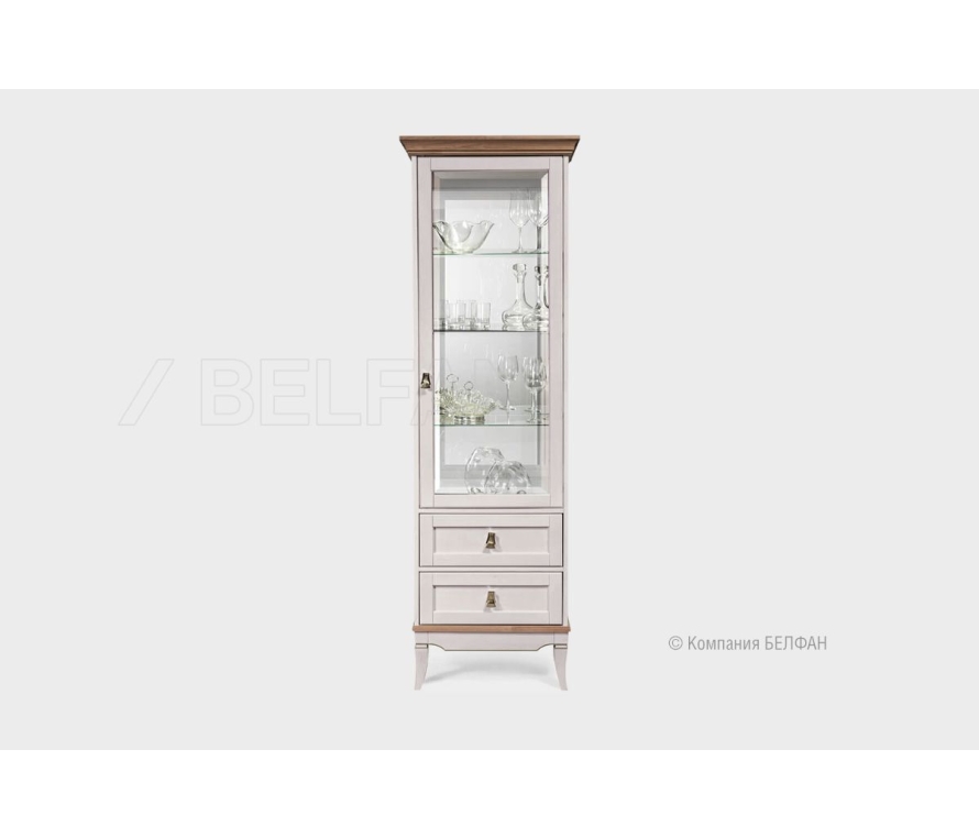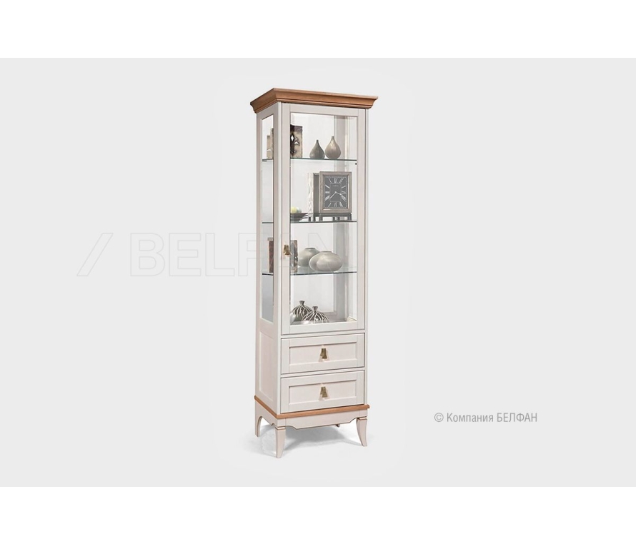 Однодверная правая витрина «Стюарт» в классическом стиле. Особенности правой однодверной витрины «Стюарт»: ? Современный классический дизайн. ? Высокие резные ножки изделия с позолоченной фрезеровкой. ? Массивные карнизы в классическом стиле. ? Резные «юбки»-цоколи с позолоченной фрезеровкой. ? Эффектная лицевая фурнитура, выполненная в форме позолоченных кисточек, которая эффектно дополняет позолоченную фрезеровку на ножках и цоколях изделий. ? Сочетание глубоких матовых эмалевых крашений с глянцевыми элементами оттенка натурального дуба. ? Задняя стенка украшена зеркалом. ? Каленные полки из прозрачного стекла, которые подчеркивает изящество. ? Европейские петли и направляющие скрытого монтажа с доводчиками дают ежедневный комфорт использования. ? В покрытии изделия используются краски и лаки на водной основе, что свидетельствует о безопасности и соответствует высоким стандартам качества. ? Карниз, передние ножки, фасады изделия изготовлены из массива дуба. ? Боковые стенки, цоколь, задние ножки изделия изготовлены из шпонированного дубом МДФ класса безопасности Е1