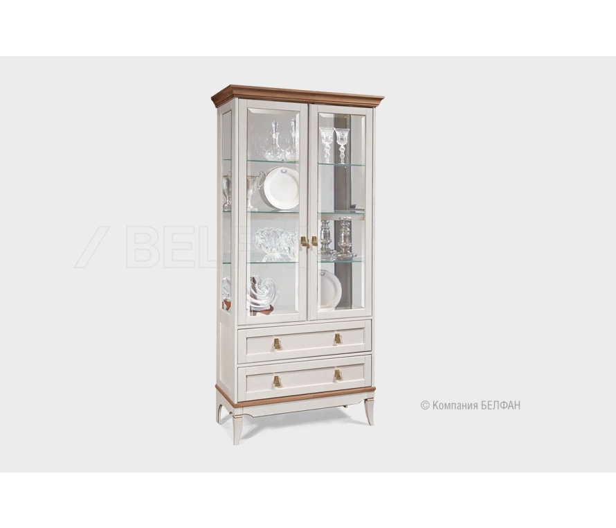 Двухдверная витрина «Стюарт» для гостиной в современном классическом стиле. Особенности двухдверной витрины «Стюарт»: ? Современный классический дизайн. ? Высокие резные ножки изделия с позолоченной фрезеровкой. ? Массивные карнизы в классическом стиле. ? Резные «юбки»-цоколи с позолоченной фрезеровкой. ? Эффектная лицевая фурнитура, выполненная в форме позолоченных кисточек, которая эффектно дополняет позолоченную фрезеровку на ножках и цоколях изделий. ? Сочетание глубоких матовых эмалевых крашений с глянцевыми элементами оттенка натурального дуба. ? Задняя стенка украшена зеркалом. ? Каленные полки из прозрачного стекла, которые подчеркивает изящество. ? Европейские петли и направляющие скрытого монтажа с доводчиками дают ежедневный комфорт использования. ? В покрытии изделия используются краски и лаки на водной основе, что свидетельствует о безопасности и соответствует высоким стандартам качества. ? Карниз, передние ножки, фасады изделия изготовлены из массива дуба. ? Боковые стенки, цоколь, задние ножки изделия изготовлены из шпонированного дубом МДФ класса безопасности Е1