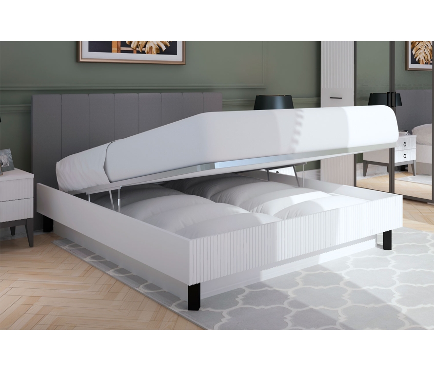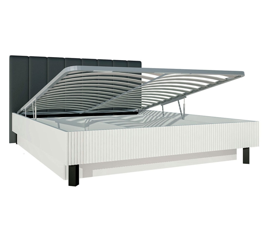 Характеристики:Цвет корпуса: белый премиум;Кровать корпусная с подъемным механизмом;Максимально допустимая нагрузка на одно спальное место — 120-150 кг;Матрас не входит в стоимость кровати;Кровать можно заказать в цвете «кашемир серый».Материалы:Боковые царги: ЛДСП 2,2 см, передняя панель — МДФ с декоративной фрезеровкой в виде вертикальных полос и окутана плёнкой ПВХ;Обивка изголовья: ткань, цвет №66, Antrazite Grey, коллекция VERONA, поставщик «Domiart»;Опоры: металлические.