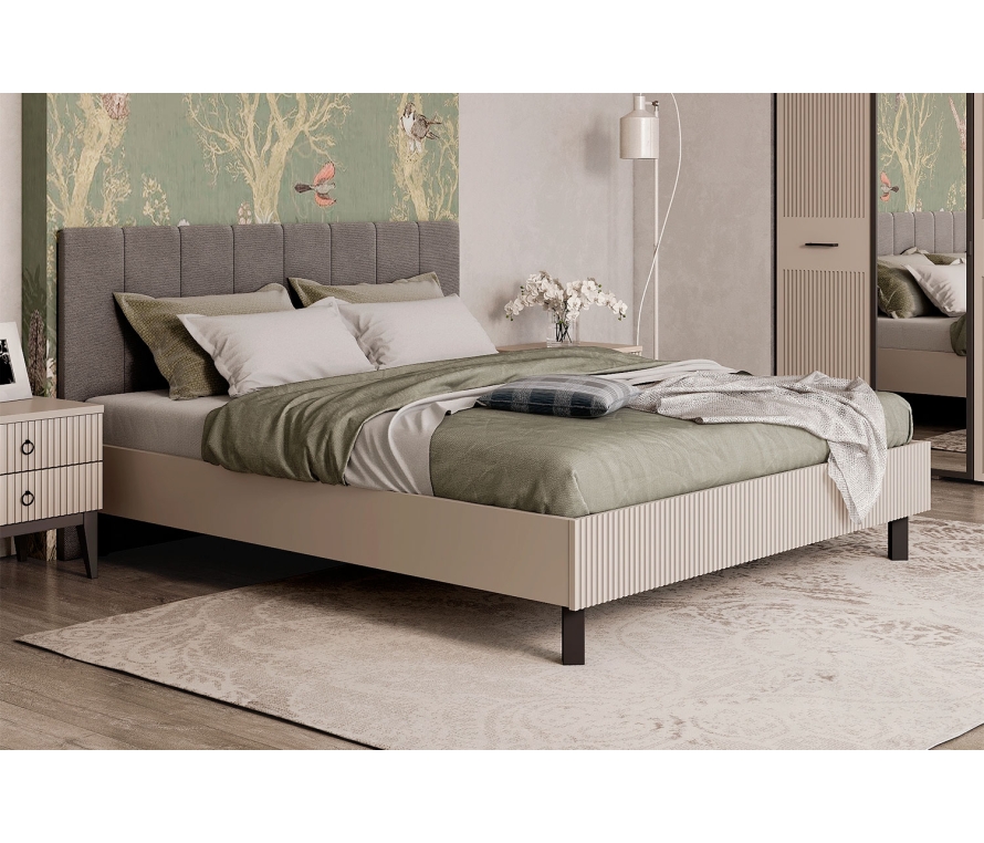 Характеристики:Цвет корпуса: кашемир серый;Кровать корпусная без подъемного механизма;Максимально допустимая нагрузка на одно спальное место — 120-150 кг;Высота ножек от пола до низа царги: 14,6 см;Матрас не входит в стоимость кровати;Кровать можно заказать в цвете белый премиум.Материалы:Боковые царги: ЛДСП 2,2 см, передняя панель — МДФ с декоративной фрезеровкой в виде вертикальных полос и окутана плёнкой ПВХ;Обивка изголовья: ткань, цвет №66, Antrazite Grey, коллекция VERONA, поставщик «Domiart»;Опоры: металлические.
