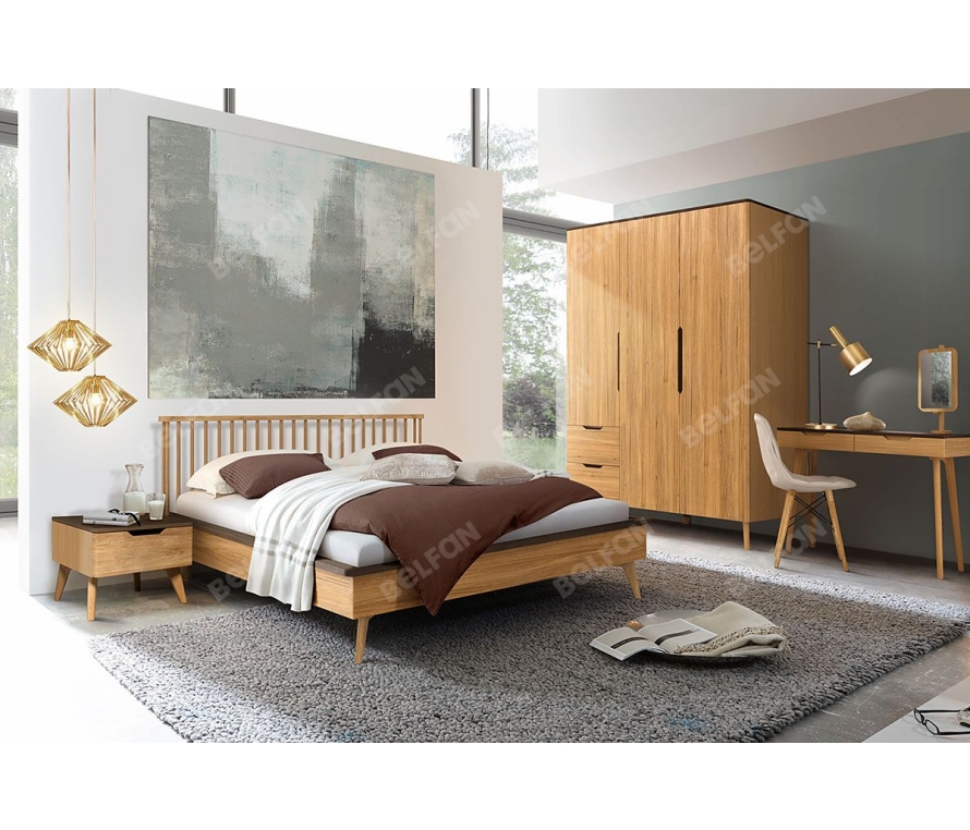 Особенности двуспальной кровати Elva (Эльва): ? Кровать изготовлена из массива и шпона дуба. ? Спальное место позволит комфортно разместиться во время сна. ? Высота ножек из массива дуба позволяет легко проводить влажную уборку, а чистота и свежесть в спальне очень важны. ? Ножки имеют скругленную (радиусную) форму по краям, что подчеркивает самобытный дизайн кровати. ? Читая книгу или журнал, очень удобно опираться на спинку. Благодаря невысокой спинки кровать можно поставить к стене с ограничениями по высоте (комната-мансарда). ? Изделие покрыто бейц-маслом – экологичным составом из натуральных компонентов. ? Двуспальная кровать подходит как для спальни, а односпальная кровать для детской или подростковой комнаты. ? Кровать не комплектуется ортопедическим основанием и матрасом, следовательно, можно подобрать его индивидуально под запрос, учитывая степень жесткости и нагрузку. Вы можете выбрать и купить ортопедическое основание и матрас на данной странице в разделе «Вам также пригодится» или на сайте в разделе «Сопутствующие товары». Специально по заказу нашей компании мировой производитель матрасов разработал линейку матрасов, которые благодаря своей универсальности подходят для большинства людей. Рекомендуем выбрать матрасы в разделе Коллекция «Матрасы» В качестве ортопедического основания рекомендуется использовать Основание «Эксклюзив без ножек» (обычное и разборное) или Основание «Эксклюзив Мультиламель» без ножек (обычное и разборное). Основание может быть установлено на бруски и продольную траверсу, однако, для максимальной устойчивости ортопедическое основание может быть установлено на регулируемые ножки. Рекомендуемая высота ножек составляет 200-230 мм. Мебель из массива дерева необыкновенно красива, добротна и славится своим долголетием. Однако, чтобы продлить этот срок, сохранить мебельным изделиям первоначальную элегантность и отличный внешний вид, за ней необходим надлежащий уход. Если у вас появились царапины, следы от кружки или мокрой тряпки, то сервис-бокс от компании BELFAN поможет вам вернуть мебели первозданный вид даже в домашних условиях. Данный сервис-бокс подходит только для мебели в крашении бейц-масло. Скачать схему сборки кровати: Схема кровати Evla: