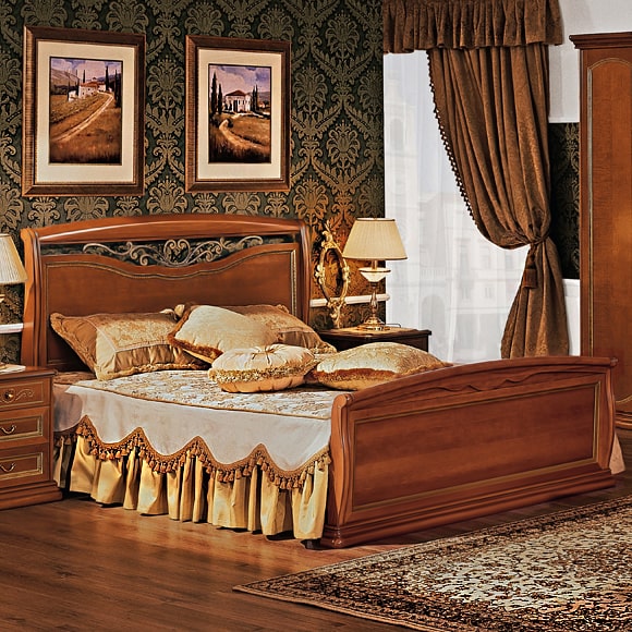 Двуспальная кровать изготовлена с использованием массива бука и шпона анегри в прозрачной отделке с золотом. Головная спинка кровати декорирована кованым элементом. Стоимость кровати указана без учета матраса и ортопедического основания. Габаритный размер указан по максимально выступающим частям изделия.