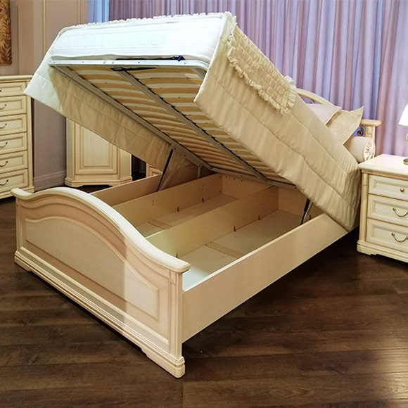 Головную спинку кровати украшает ажурная ковка и резные накладные декоративные элементы. Мебель выполнена в нежном кремовом цвете, отделка патиной. Стоимость кровати указана без учета матраса и ортопедического основания. Габаритный размер указан по максимально выступающим частям изделия.