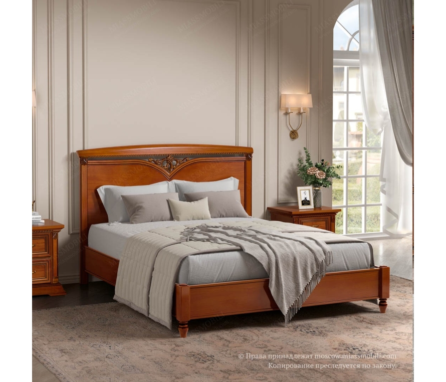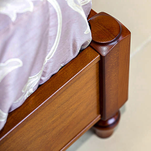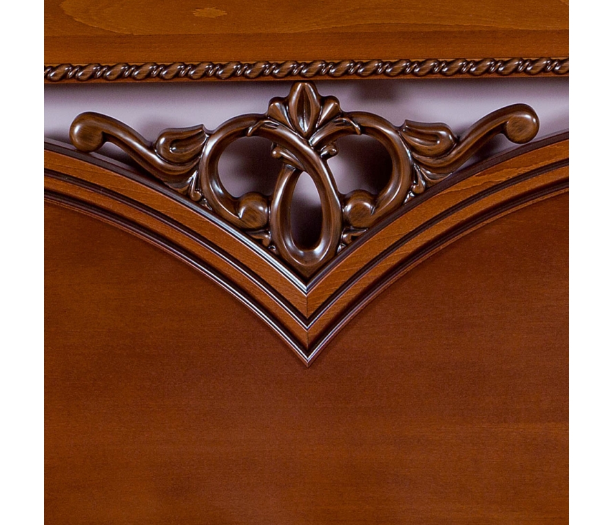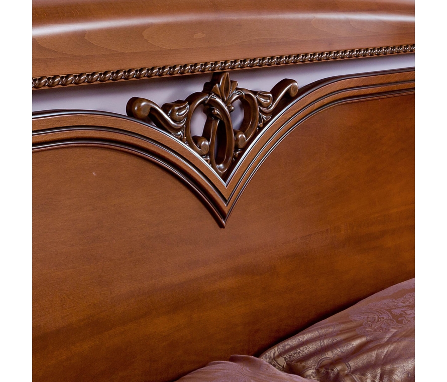 Кровать без ножной спинки Лоренцо изготовлена с использованием массива бука и шпона анегри в цвете «вишня». В отделке используется патинирование. Центральную часть кровати украшает резной элемент. Небольшие резные элементы, расположенные на вертикальных брусках-колоннах дополняют и делают узнаваемым облик всего набора. Кровать может комплектоваться основанием с механизмом подъема и бельевыми ящиками.