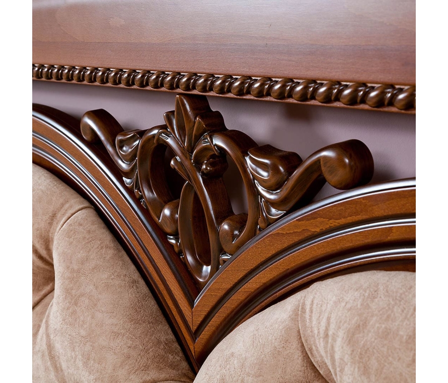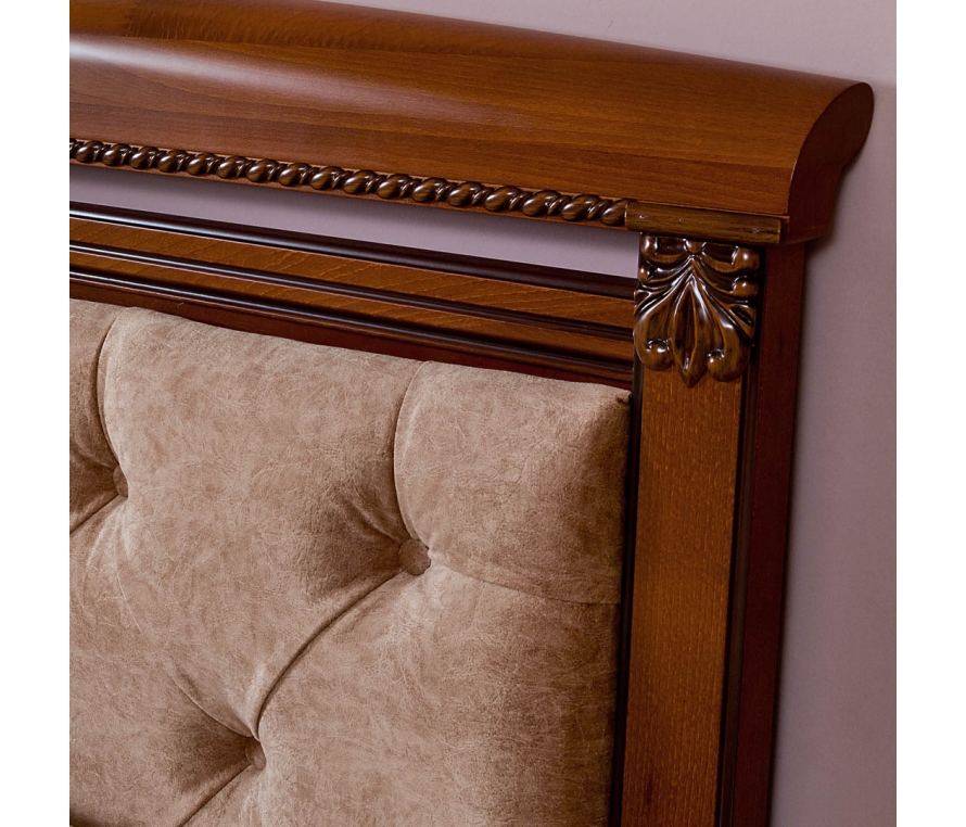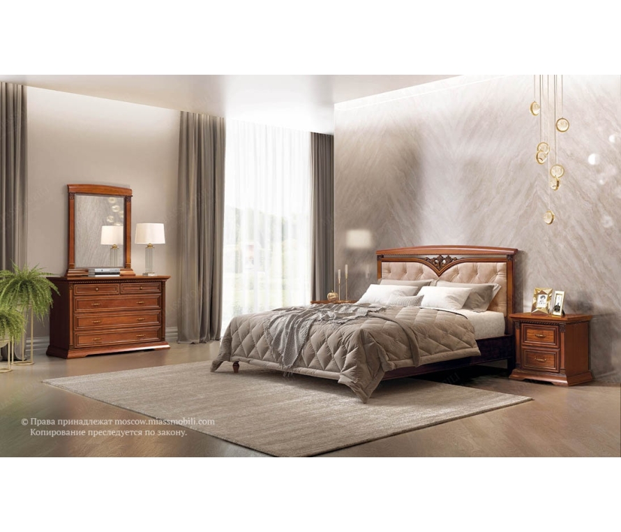 Кровать с драпированной и без ножной спинки Лоренцо изготовлена с использованием массива бука и шпона анегри в цвете «вишня». В отделке используется патинирование. Центральную часть кровати украшает резной элемент. Небольшие резные элементы, расположенные на вертикальных брусках-колоннах дополняют и делают узнаваемым облик всего набора. Кровать может комплектоваться основанием с механизмом подъема и бельевыми ящиками.