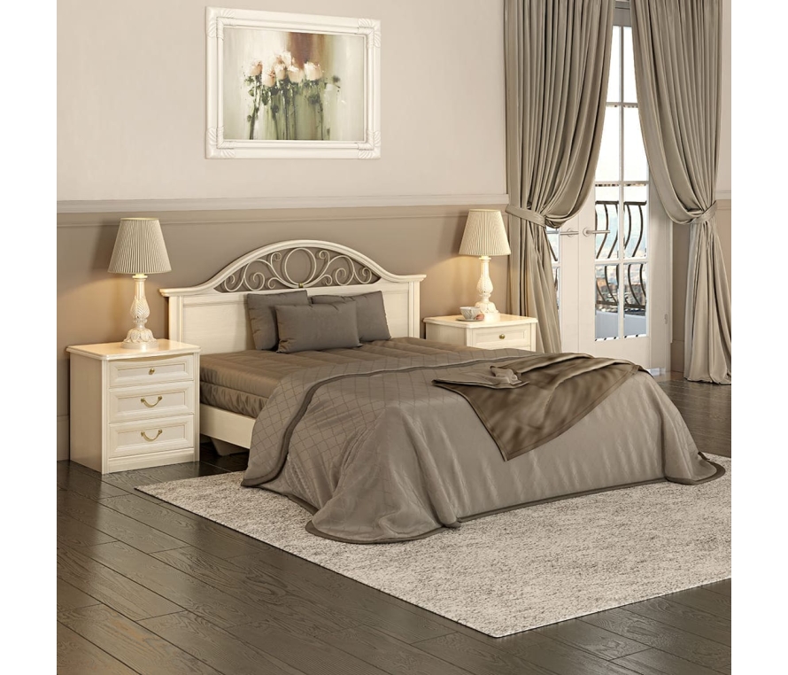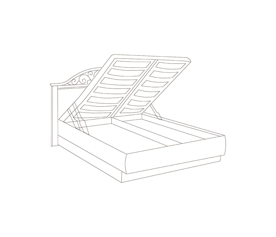 Двуспальная кровать с гнутой головной и без ножной спинки. Головная спинка декорирована ажурным кованым элементом. Кровать комплектуется ящиком для белья. Дополнительно необходимо приобрести подъемный механизм. Стоимость указана без учета матраса и основания с подъемным механизмом. Габаритный размер указан по максимально выступающим частям изделия.