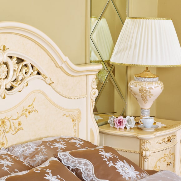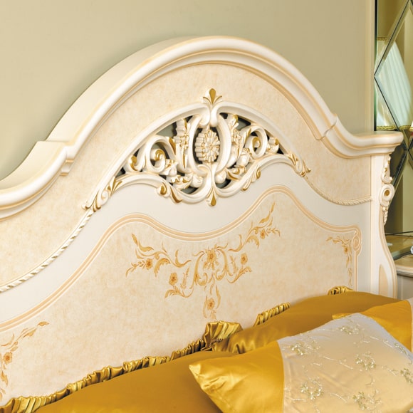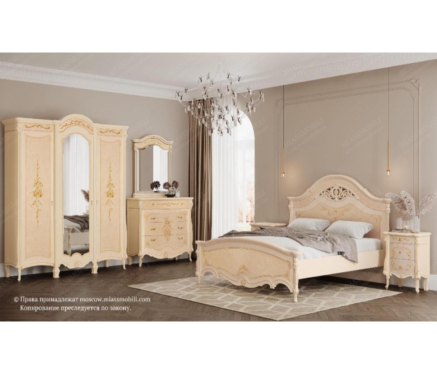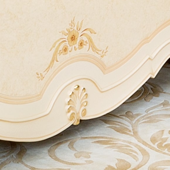 В отделке двуспальной кровати используются декоративные резные элементы с позолотой. Головная и ножная спинки украшены художественная ручной росписью. Габаритный размер указан по максимально выступающим частям изделия. Стоимость кровати указана без учета матраса и ортопедического основания.