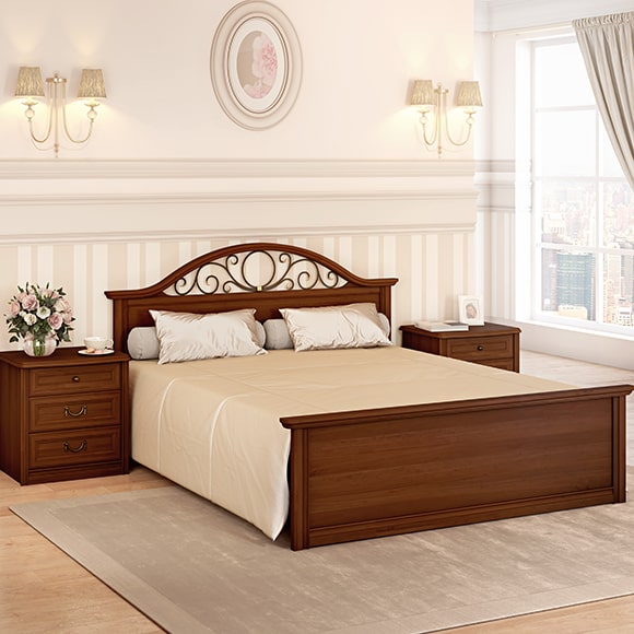 Кровать из коллекции Екатерина с прямой ножной спинкой выполнена в цвете орех. Головная спинка украшена ажурным кованным элементом. Стоимость указана без учета матраса и ортопедического основания. Габаритный размер указан по максимально выступающим частям изделия.