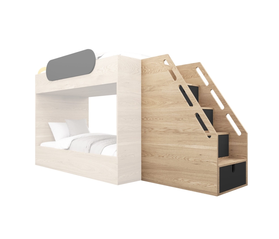 Габариты внешние: 142х64х96смФасад: Фанера в эмали Корпус: Фанера в шпоне дуба. Покрытие лакФурнитура: Blum (Австрия) с отталкивателемСрок изготовления: 30 рабочих дней Лестница с ящиками – это не просто удобный способ забраться на кровать, но и эргономичный способ хранения вещей. Наши лестницы изготовлены из прочной фанеры в дубовом шпоне, наружная отделка имеет текстуру натурального дерева. Фасад ящиков покрыт эмалью с 22 цветовыми опциями на выбор.Лестницы оснащены перилами, чтобы подъем на верхний ярус был безопасным и комфортным для ребенка. Опции соединения лестниц с кроватью:- Прямая (присоединяется к торцу наподобие трапа)- Правая (располагается с правой стороны кровати)